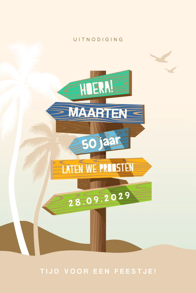 Een hippe uitnodiging om te vieren dat je Abraham hebt gezien. Op deze tropische kaart zie je een houten wegwijzer in het zand met op de achtergrond palmbomen. Met deze zomerse kaart kom je helemaal in de strand sferen, laat het feestje maar beginnen!