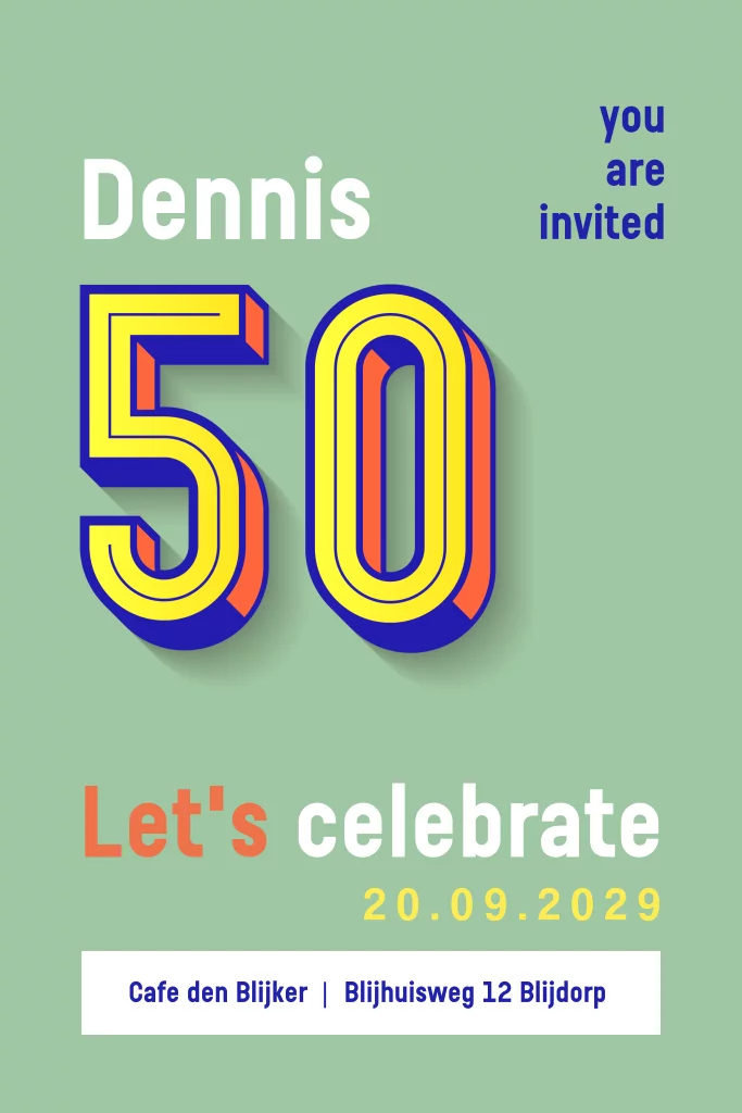 50 geworden en Abraham gezien? Let's celebrate met deze typografische verjaardag uitnodiging! Op deze uitnodiging zie je verschillende lettertypes tegen een groene achtergrond. Het cijfer 50 springt er extra uit! De gehele combinatie van kleuren en lettertypes geeft deze kaart een retro uitstraling.