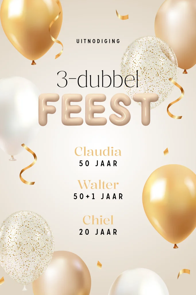 Feestelijke uitnodiging voor een 3-dubbel feest. Hoe bijzonder, 3 mijlpalen van een verjaardag! Deze uitnodiging heeft een mooi zacht maar toch ook feestelijk design met beige achtergrond en gouden ballonnen en confetti. Pas de kaart naar eigen wens aan in de editor. Ook kun je zelf bepalen of je ronde hoeken wilt.