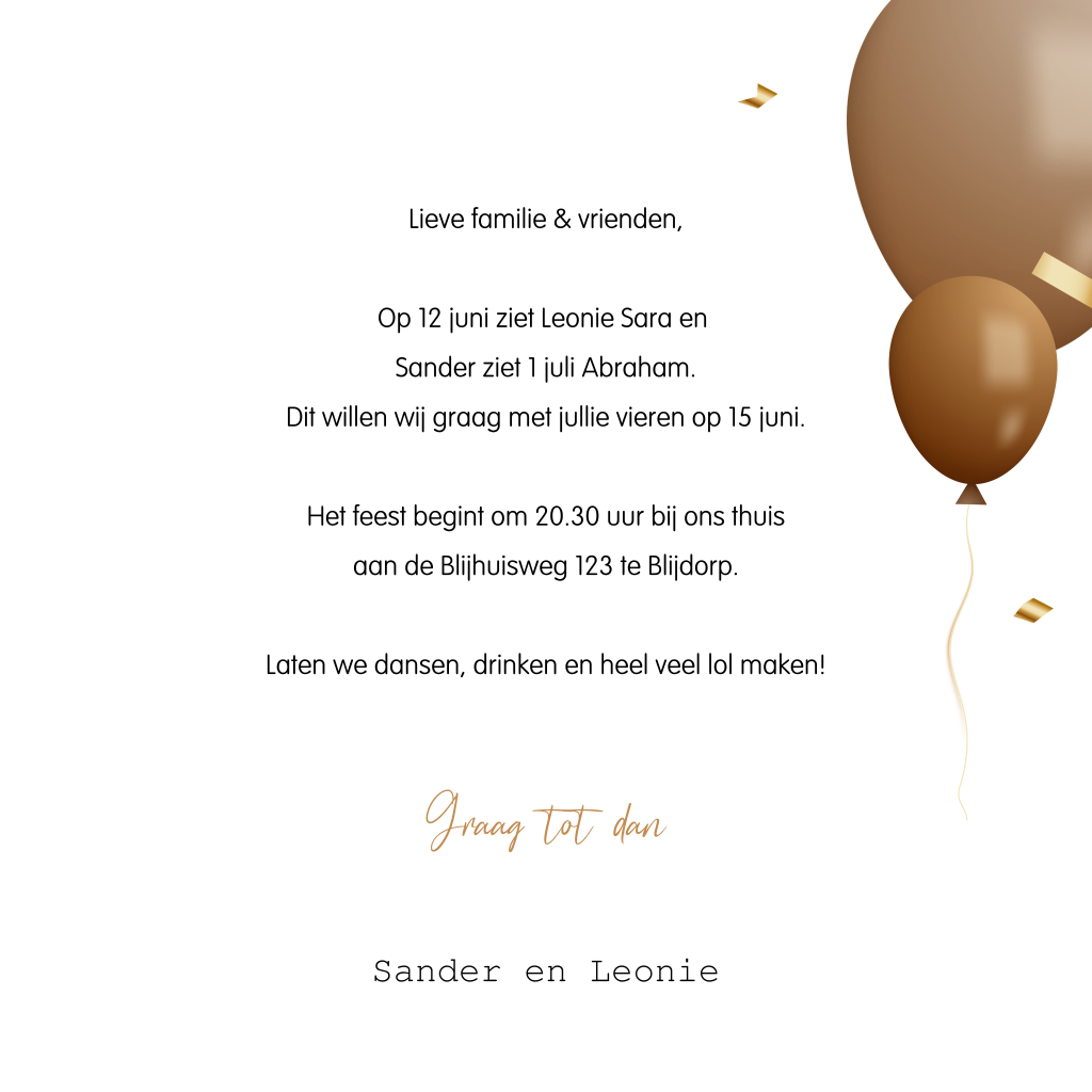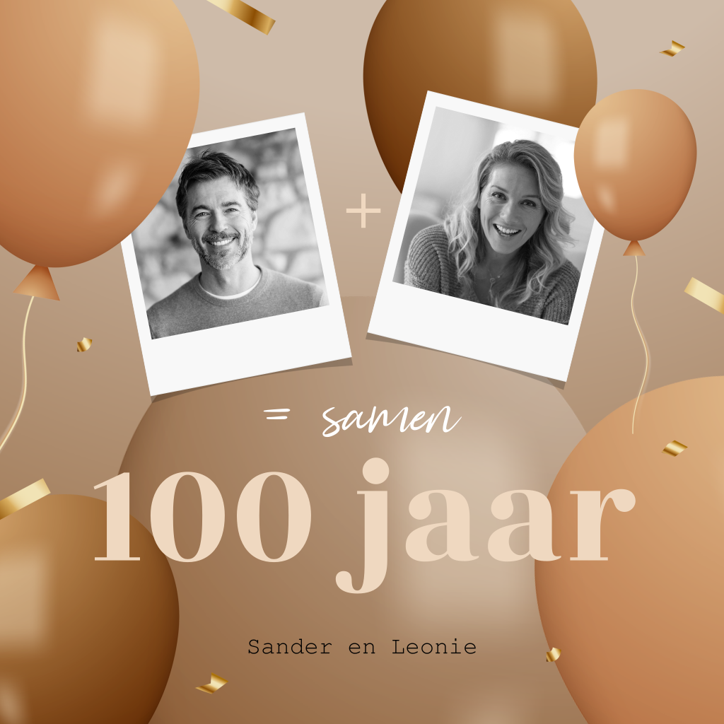 Zijn jullie samen 100 jaar? Wat een mijlpaal, dit moet gevierd worden! Stuur je familie en vrienden deze feestelijke uitnodiging en nodig ze uit voor een feestje. Deze trendy verjaardag uitnodiging heeft een zachte bronzen kleur met ballonnen en gouden confetti. Extra leuk is de mogelijkheid om een mooie foto van jullie zelf op deze uitnodiging te zetten. Pas de kaart geheel naar eigen wens aan in de editor. Vragen of hulp nodig? We helpen je graag!