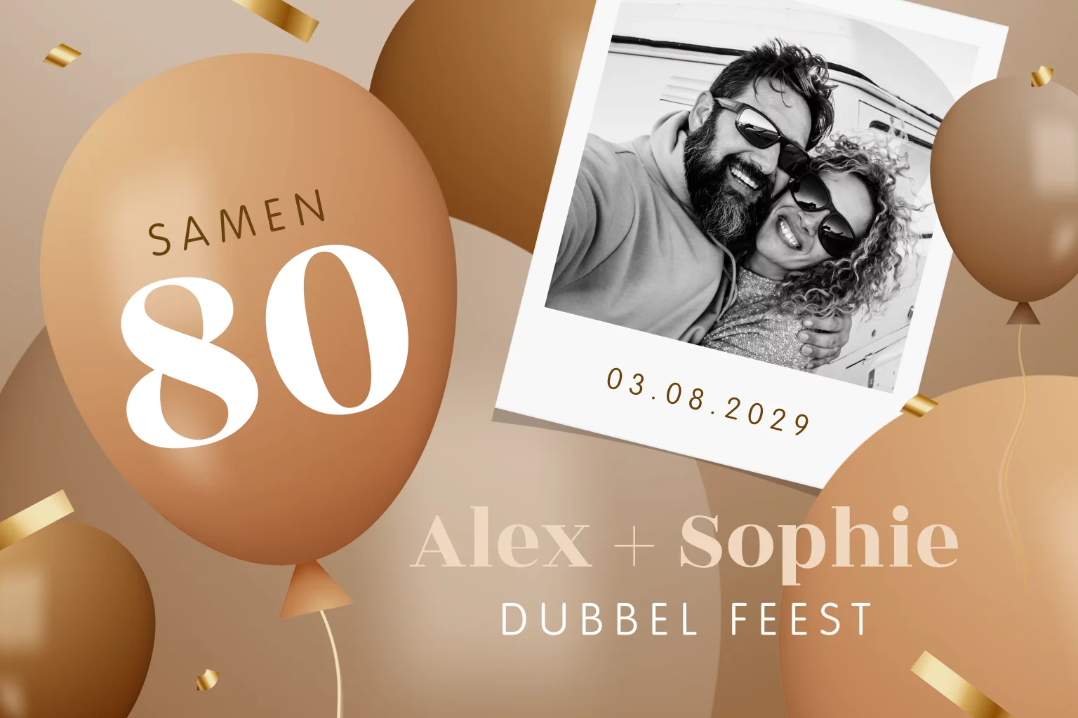 Worden jullie samen 80 jaar? Vier deze mijlpaal met een gezellig feest! Stuur deze prachtige bronskleurige uitnodiging naar al je vrienden en familie en nodig ze uit voor jullie dubbele feest. Op deze feestelijk verjaardag uitnodiging voor samen 80 jaar staan ballonnen met goudkleurige confetti. Zet in het fotokader een leuke spontane foto van jullie als stel. Teksten en lettertypes zijn aan te passen in de editor.