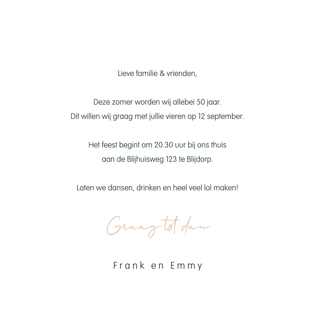 Prachtige uitnodiging voor een dubbel feest met kleurverloop en eigen foto. Geven jullie een tuinfeest om jullie verjaardag van samen 100 jaar te vieren? Nodig dan iedereen uit met deze hippe uitnodiging. Deze verjaardag uitnodiging heeft een mooi blauw kleurverloop en is aan te passen naar alle gewenste kleuren. Door de blauwe kleur lijkt het alsof je in de tuin staat in de avond, de lampjesslinger maakt het helemaal af. Zet in het fotokader een foto van jullie samen.
