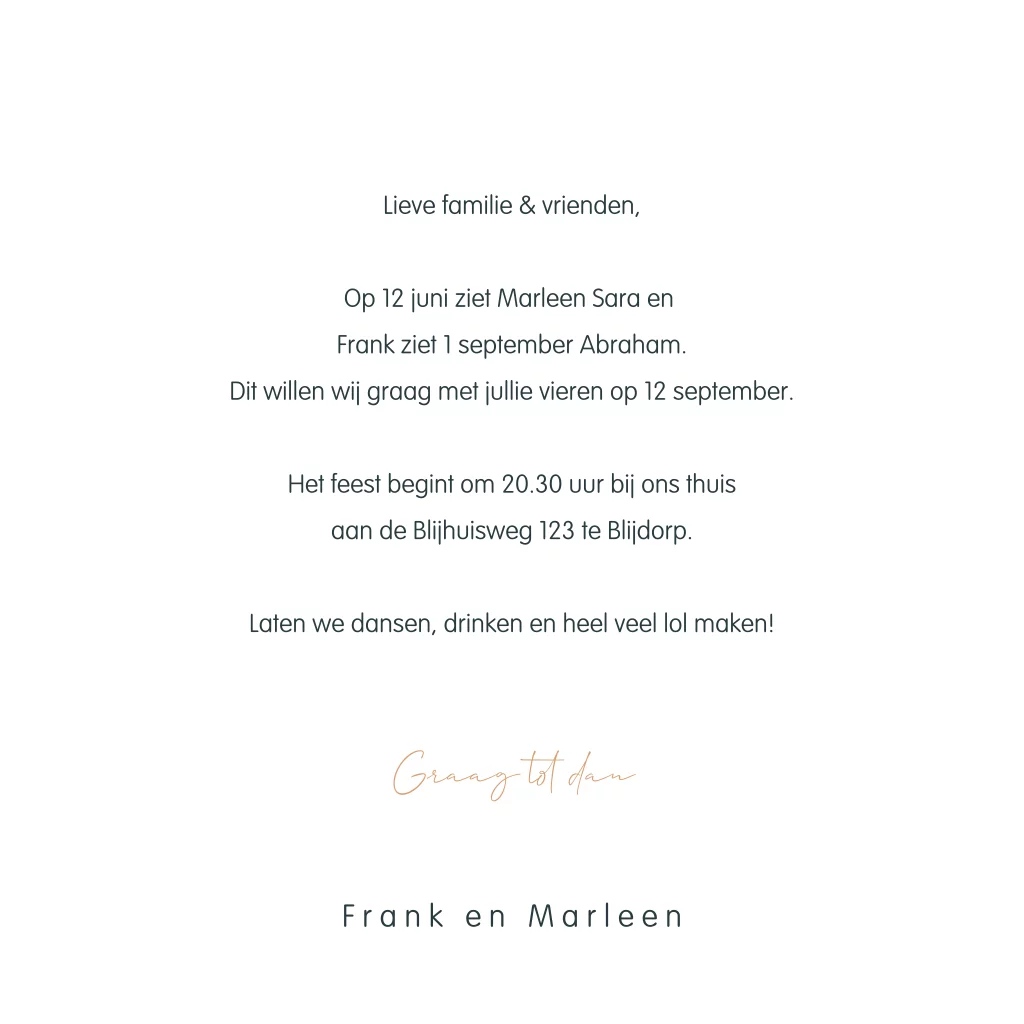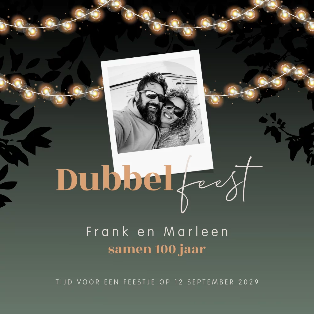 Prachtige uitnodiging voor een dubbel feest met kleurverloop en eigen foto. Geven jullie een tuinfeest om jullie verjaardag van samen 100 jaar te vieren? Nodig dan iedereen uit met deze hippe uitnodiging. Deze verjaardag uitnodiging heeft een mooi groen kleurverloop en is aan te passen naar alle gewenste kleuren. Door de groene kleur lijkt het alsof je in de tuin staat in de avond, de lampjesslinger maakt het helemaal af. Zet in het fotokader een foto van jullie samen.