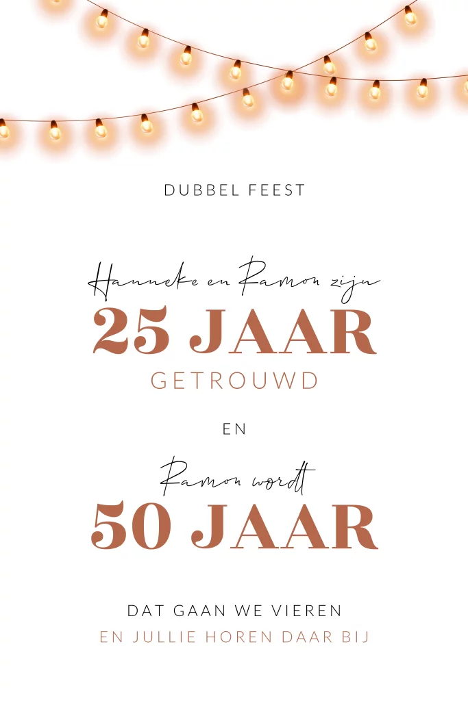 Uitnodigingskaart voor een huwelijks jubileum 25 jaar getrouwd én een verjaardag 50 jaar. Deze uitnodiging voor dubbel feest is wit gecombineerd met koperkleur. Natuurlijk is het mogelijk om 25 jaar getrouwd of 50 jaar aan te passen naar andere getallen.