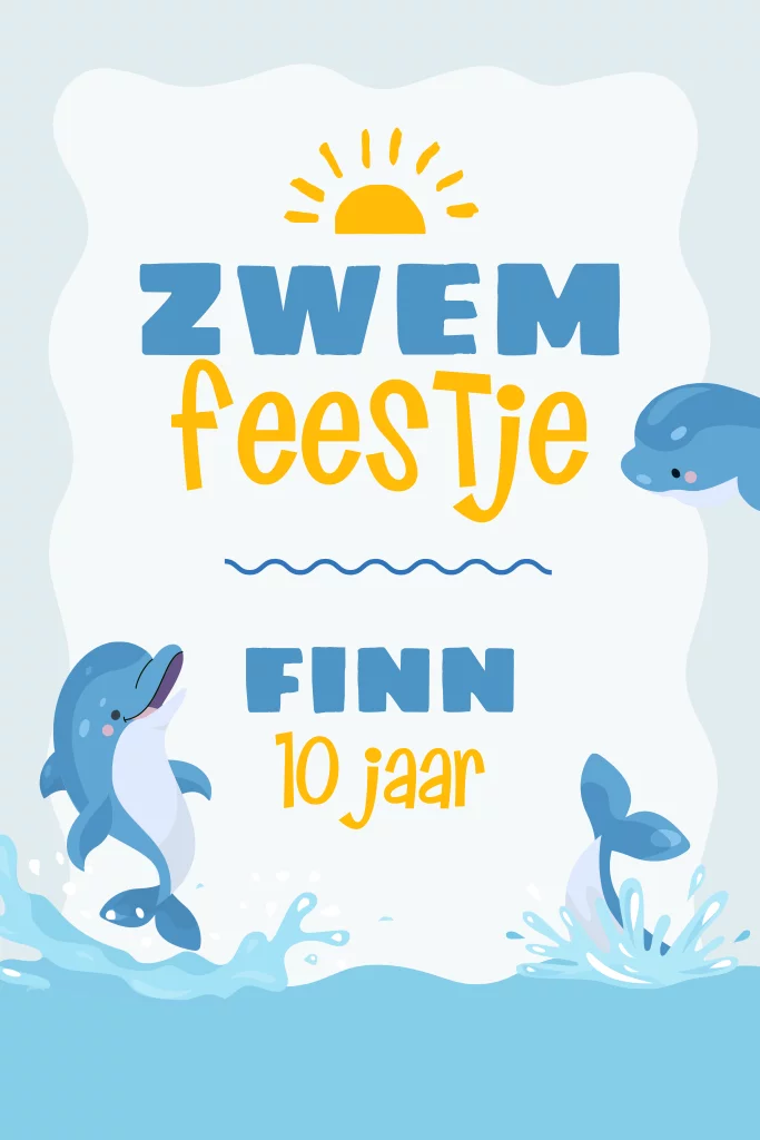 Uitnodiging zwemfeestje voor een kinderverjaardag! Op deze leuke uitnodiging zie je illustraties van vrolijke, springende dolfijnen in het water. Pas kleuren en lettertypes naar eigen wens aan in onze online editor om er een persoonlijke uitnodiging van te maken. Hulp nodig bij het maken van een zwemfeestje uitnodiging? Wij helpen je graag!