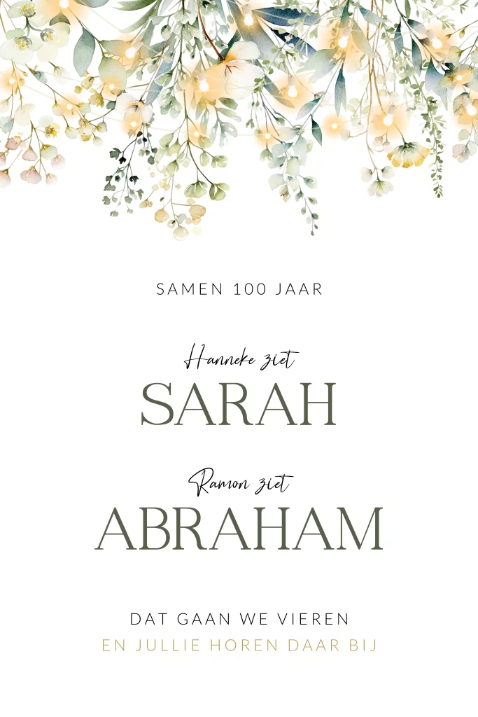 Samen 100 jaar is dubbel feest! Uitnodigingskaart voor een toekomstige Abraham en Sarah. Op deze verjaardagskaart staan takken met feestelijke lampjes. De kleuren en teksten naar eigen wens aan te passen in de editor.
