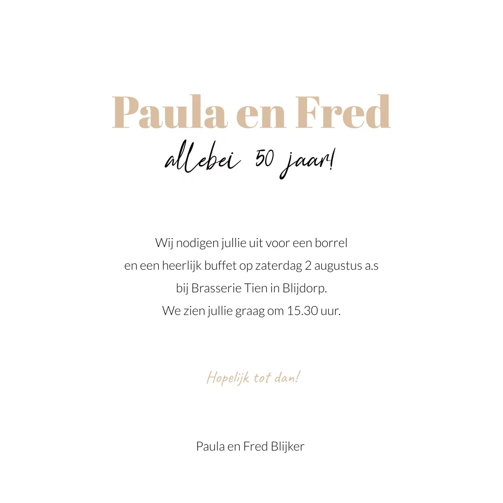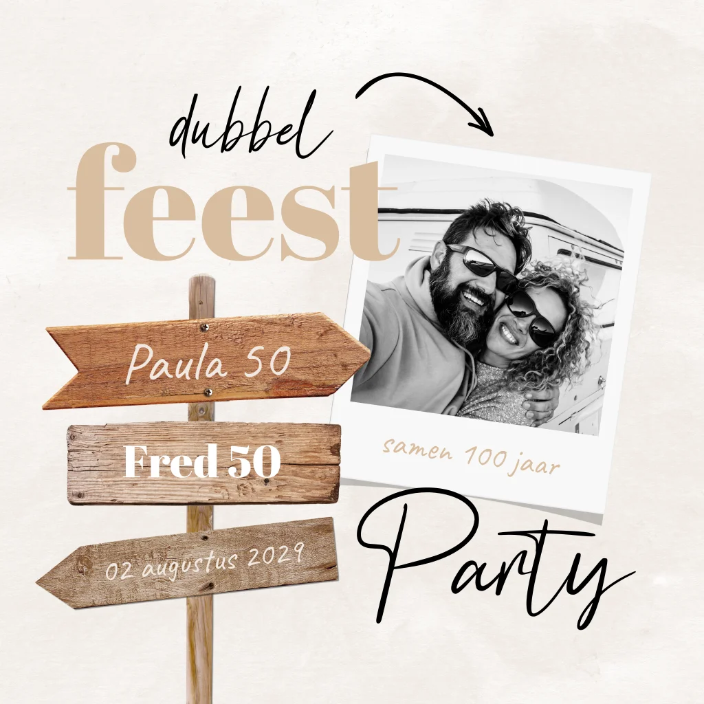 Uitnodigingskaart voor dubbel feest, een verjaardag samen 100 jaar. Op deze uitnodiging voor 2x 50 jaar staat een houten paal met wegwijs bordjes. Op de achtergrond een beige aquarel. Teksten en lettertypes pas je aan in de editor.