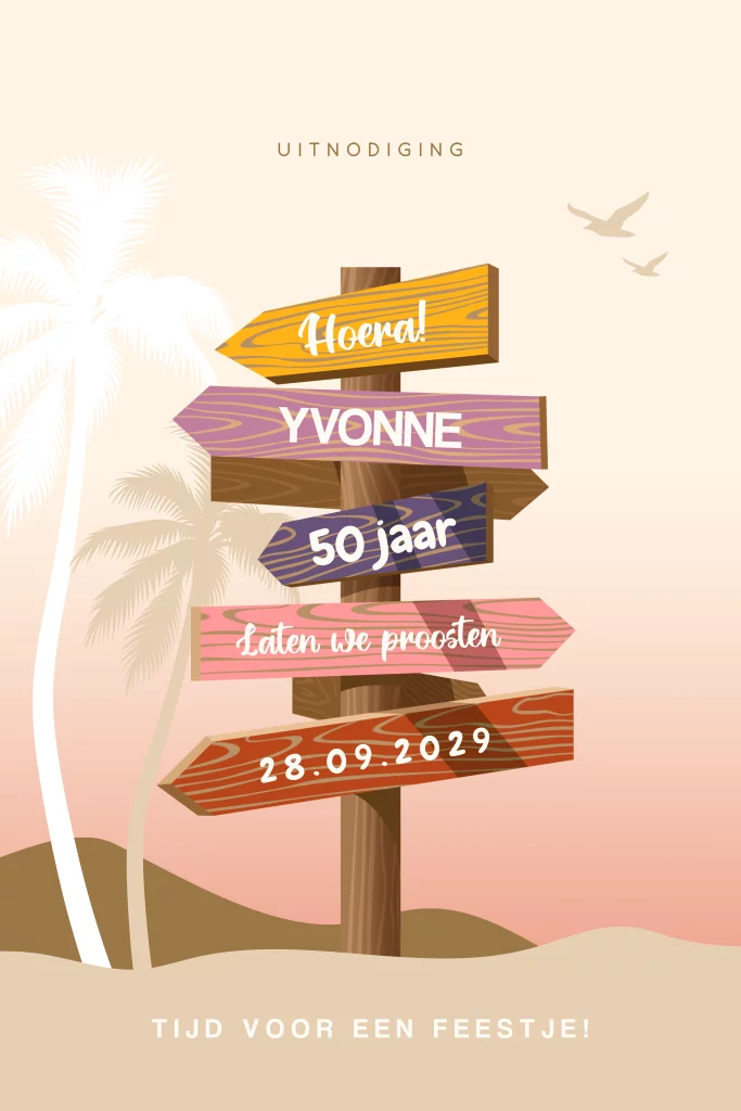 Sarah gezien? Tijd voor een feestje! Nodig je vrienden en familie uit met deze zomerse uitnodigingskaart voor je 50ste verjaardag. Met deze kaart kom je helemaal in de strandsferen door de houten wegwijzer in het zand en de palmbomen en vogels op de achtergrond. De achtergrond heeft een roze en beige kleur waardoor het lijkt alsof de zon net ondergaat.