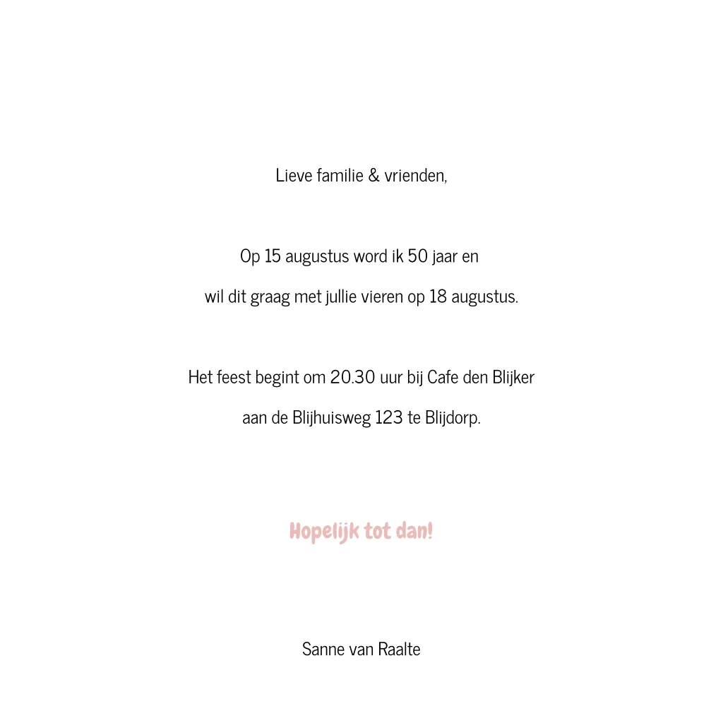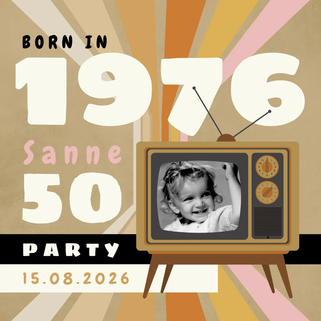 Born in 1976? Let's party, want jij bent hebt Sarah gezien! Nodig alle gasten uit voor jouw feest met deze geweldige vintage kaart. Op deze verjaardag uitnodiging voor 50 jaar staan verschillende lettertypes in wit, zwart en roze met een retro tv. Zet hier je eigen foto in en maak van deze kaart je eigen persoonlijke uitnodiging. De gehele combinatie van kleuren en lettertypes geeft deze kaart een retro uitstraling. Je kunt deze uitnodiging zelf gemakkelijk bewerken, opslaan en bestellen.