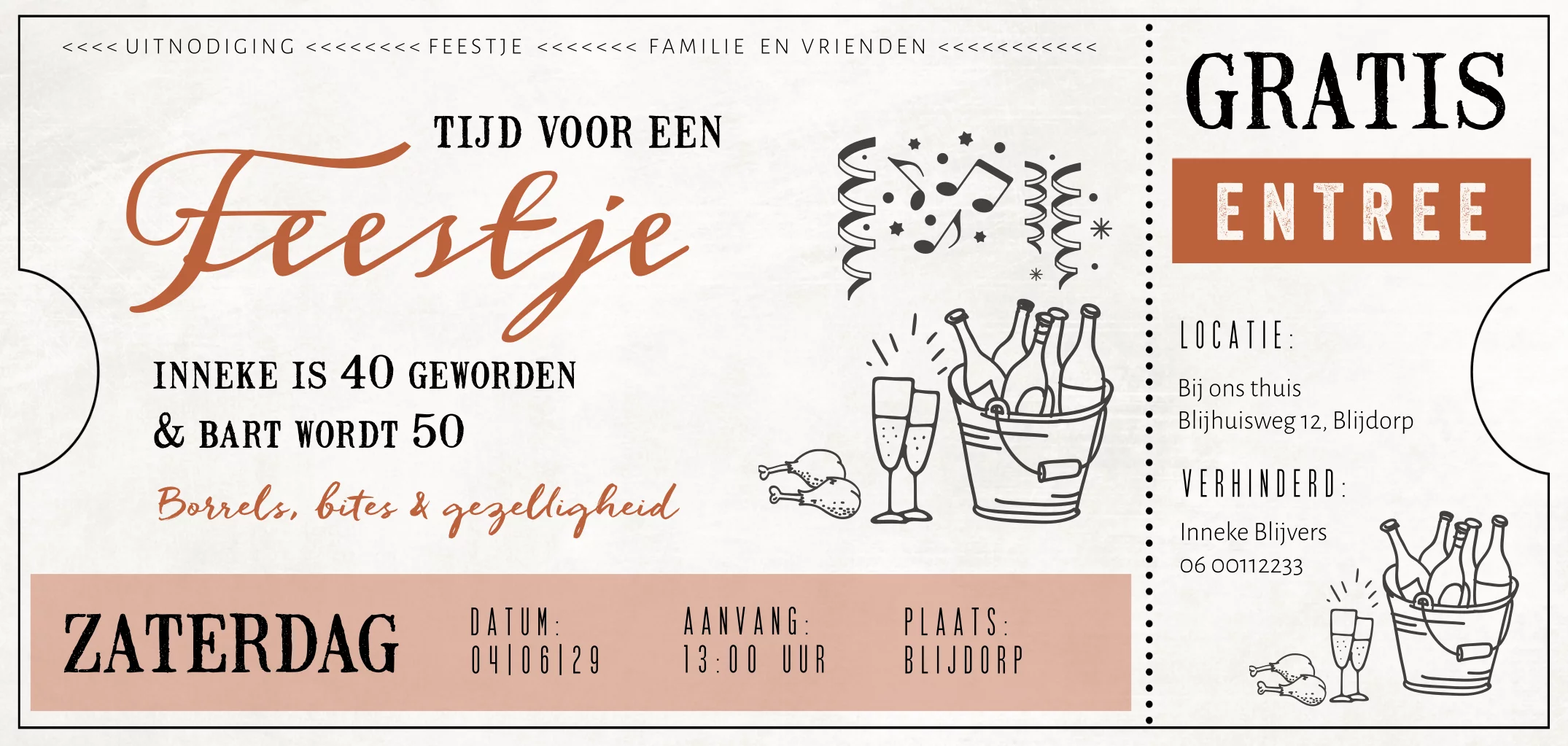 Vier jullie dubbel feest met deze typografische retro uitnodiging voor een 40ste en 50ste verjaardag. Op deze kaart staat confetti, kip en champagne afgebeeld. Erg toepasselijk door de tekst 'borrel, bites en gezelligheid'!