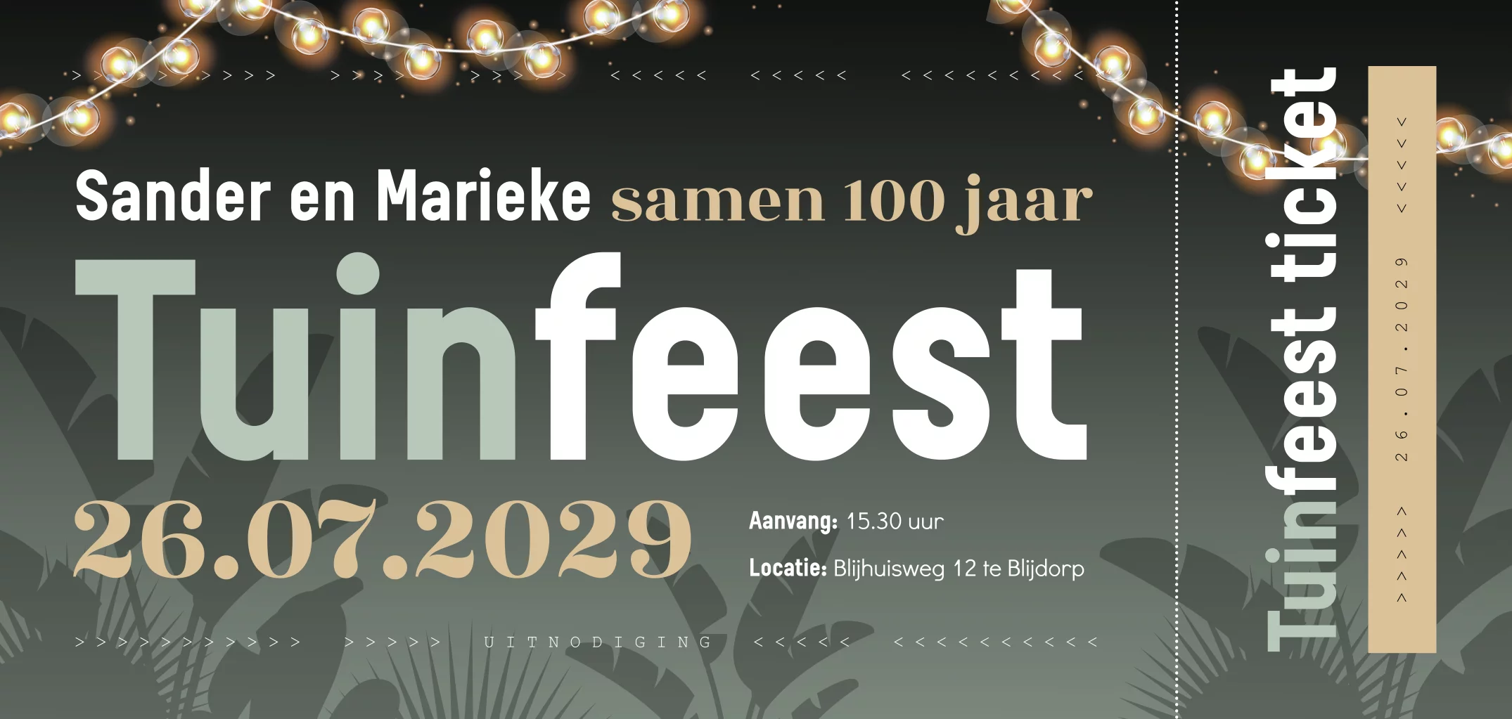 Zijn jullie samen 100 jaar en vieren jullie dit dubbel feest? Hoe leuk is het om een tuinfeest te geven! Nodig al je gasten uit met deze originele uitnodiging voor een verjaardag en themafeest. De uitnodiging is een tuinfeest ticket in ticketvorm. Een originele en trendy uitnodiging. De stijl van het ticket past helemaal bij een tuinfeest door de groene kleur, warme lampenslinger en bladeren op de achtergrond.