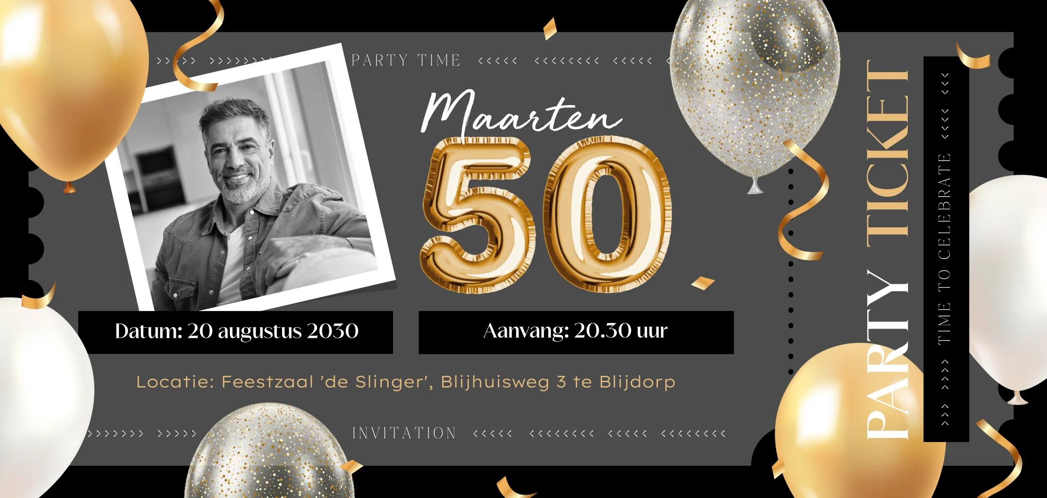 Ticket verjaardagsuitnodiging met ballonnen en confetti voor een 50ste verjaardag. Deze uitnodiging is stoer en feestelijk tegelijk. Een heus party ticket voor je eigen verjaardagfeest. Laat iedereen weten dat je 50 jaar bent geworden en het party time is omdat je Abraham ziet! Zet in het fotokader een eigen foto. Pas naar eigen wens de kleuren en lettertypes aan in onze online editor. Hulp nodig? Ons team helpt je graag!
