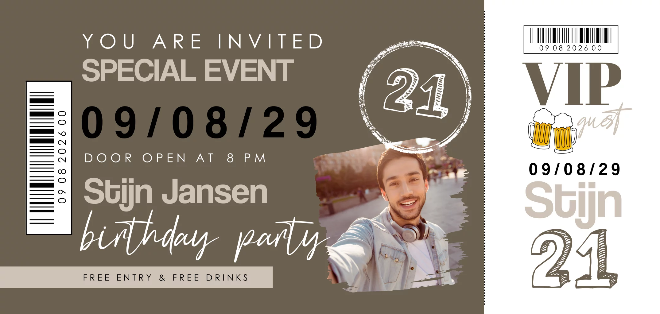 Een stoere, hippe verjaardagsuitnodiging voor een 21 party van een man! Deze ticketkaart heeft afgeronde hoeken en een bierglazen illustratie. Voeg een eigen foto toe van de jarige voor de persoonlijke touch. Wie nodig jij als VIP uit voor jouw feestje?