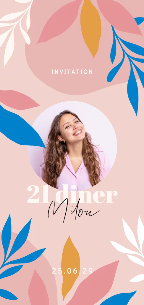 Kleurrijke uitnodigingskaart voor een 21 diner party. Op deze verjaardagskaart staan gekleurde abstracte bladeren en een leuke eigen foto. De foto is gemakkelijk te vervangen. Nodig je vriendinnen uit voor jouw speciale verjaardag met deze vrolijke uitnodiging. Pas de teksten en kleuren naar je eigen smaak aan in de editor.