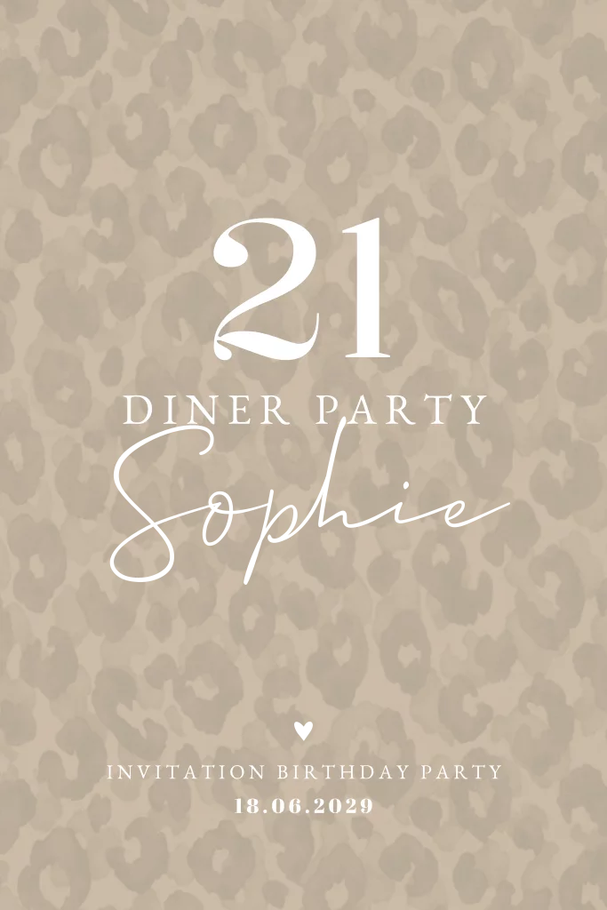 It's party time girls! Superleuke hippe uitnodiging voor een 21 diner party met dierenprint. Met de naam van de jarige in luxe goudfolie, classy en feestelijk. Ook mooi met roséfolie of koperfolie, de kleur van de folie kun je in de ontwerpmodule zelf gemakkelijk aanpassen. De ronde hoeken maken het helemaal af!