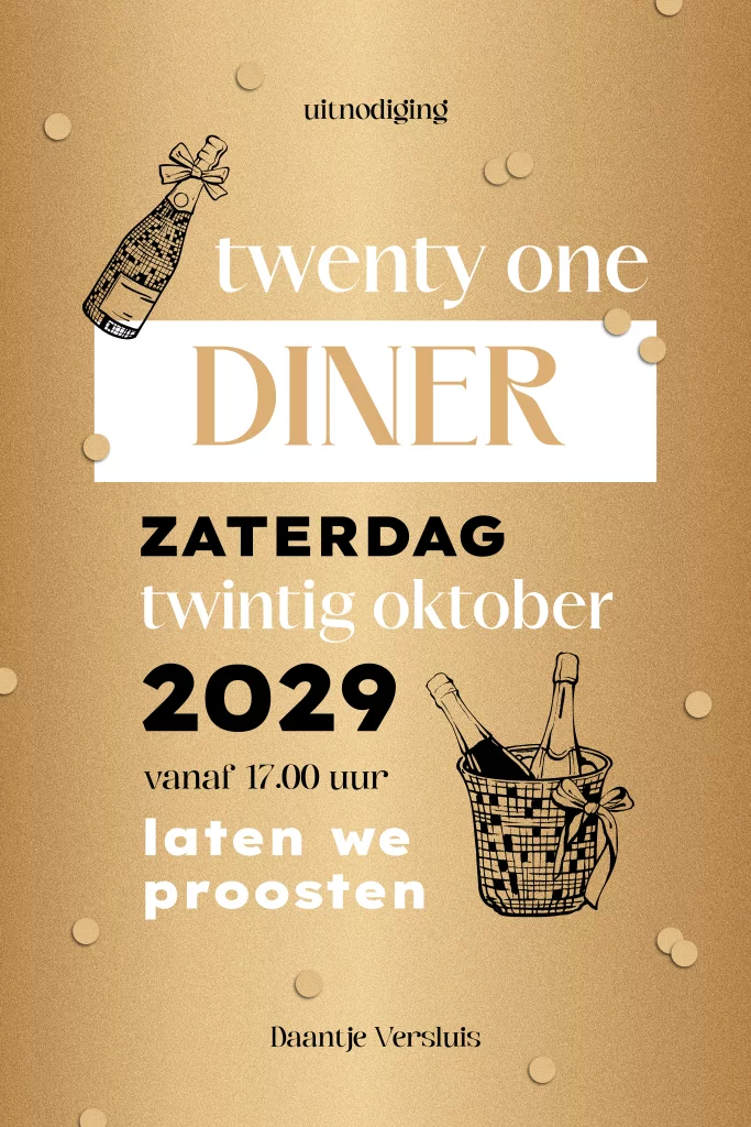 Een hippe uitnodigingskaart met een champagnefles en confetti in goudlook. Leuk om je 21 diner mee aan te kondigen. Stijlvol en feestelijk. Time to party!