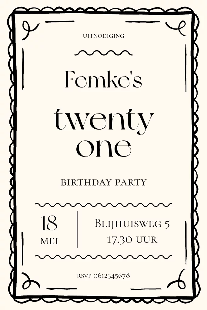 Vier je 21 diner met deze stijlvolle typografische uitnodiging! Deze uitnodiging is perfect voor een vrouw die haar 21 diner uitgebreid wil vieren. Het speelse zwarte kader en de typografische zwarte tekst zorgen voor een chic tintje. Pas deze uitnodiging naar eigen wens aan in de online editor. Met de oudroze envelopkleur maak je deze uitnodiging helemaal in stijl af.