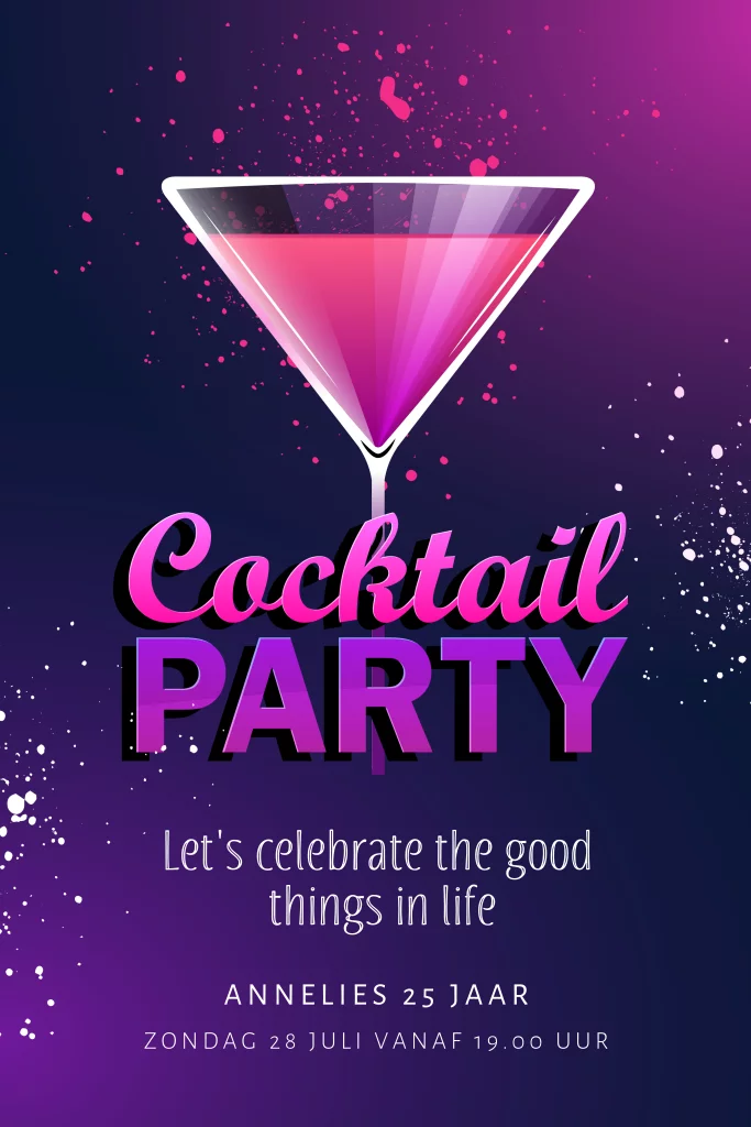 Een kleurrijke en hippe uitnodigingskaart voor je cocktailparty! nodig je vrienden op deze stijlvolle manier uit om samen het leven te vieren. hippe kaart met cocktailglas en pakkende tekst: let's celebrate the good things in life.