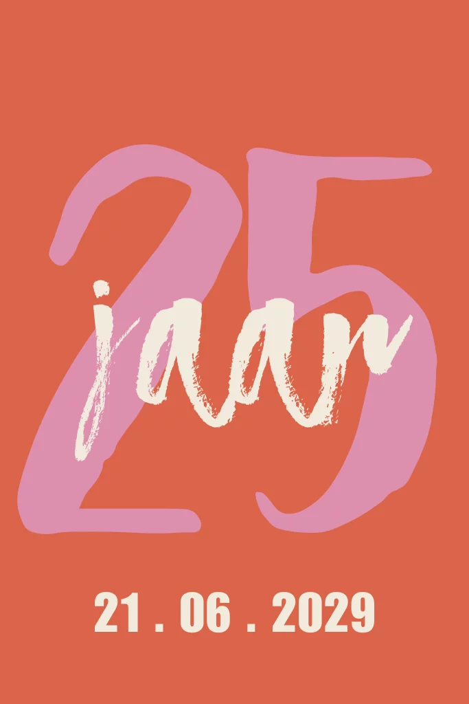 Moderne typografische uitnodiging voor een 25ste verjaardag. Op deze kaart een oranje rode achtergrond met het getal 25 in grote roze cijfers, laat iedereen hiermee zien dat jij jarig bent en een feestje geeft! Pas deze kleurrijke uitnodiging naar je eigen smaak aan in de editor.