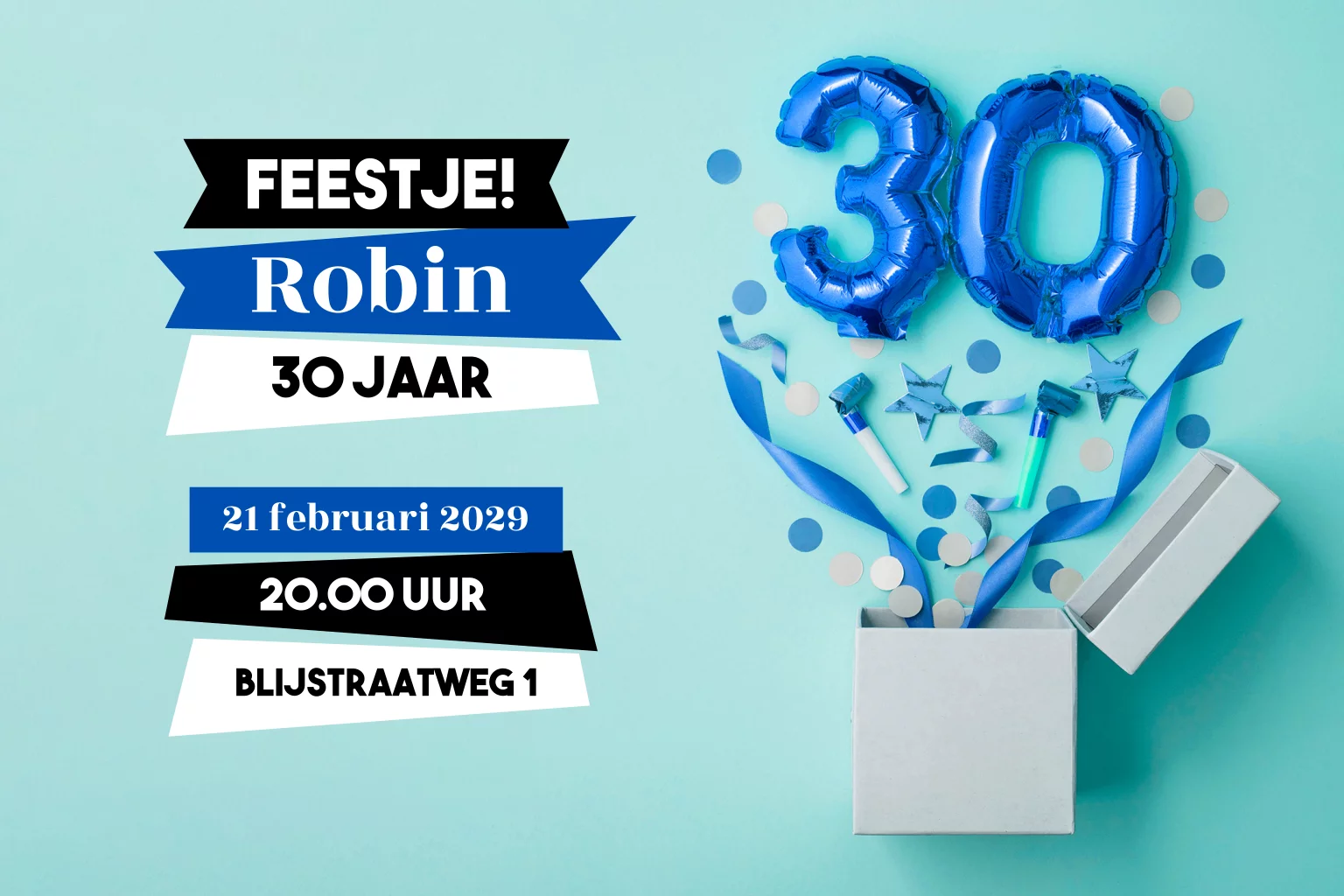 Deze uitnodigingskaart is perfect voor het vieren van je 30e verjaardag. In stoere blauwtinten is deze uitnodiging vormgegeven. Je ziet het getal 30 in ballon foil met confetti uit een doosje springen. Pas deze kaart voor een man naar eigen wens aan en maak deze uitnodiging helemaal in stijl af met de koningsblauwe envelopkleur.