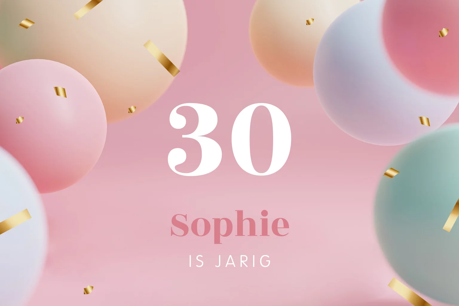 30 geworden? Tijd voor een feestje! Verstuur deze prachtige uitnodiging met ballonnen in pastel tinten en gouden confetti. Pas de teksten eenvoudig aan in de editor.