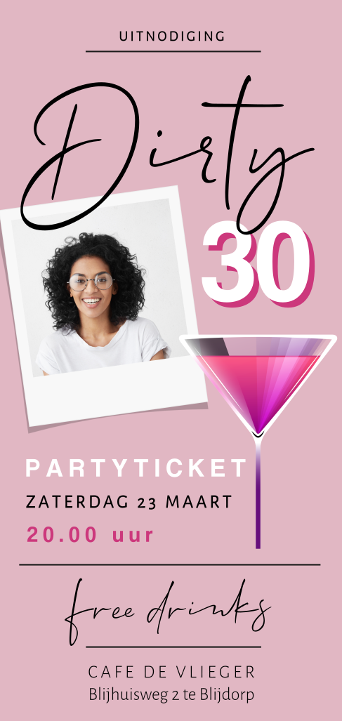 Dirty 30! Vrolijk roze gekleurde partyticket voor een 30ste verjaardag met cocktailglas. Er is gebruik gemaakt van verschillende lettertypes. Vervang de foto in het polaroid kader voor een eigen foto.