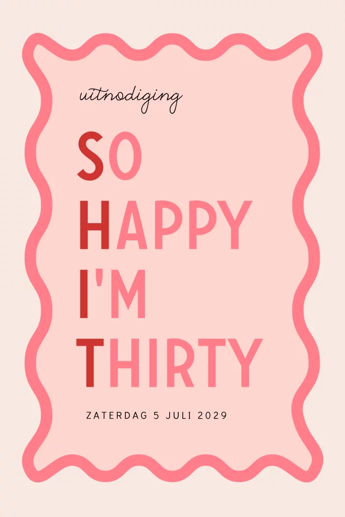Een grappige 30e verjaardagsuitnodiging met de tekst 'So Happy I'm Thirty'. Perfect voor een vrouw die haar mijlpaal wil vieren met een vleugje humor. Dit kaartje bevat een opvallend golvend roze kader. Maak deze uitnodiging helemaal af met de berry envelopkleur en laat je gasten versteld staan van je uitnodiging!