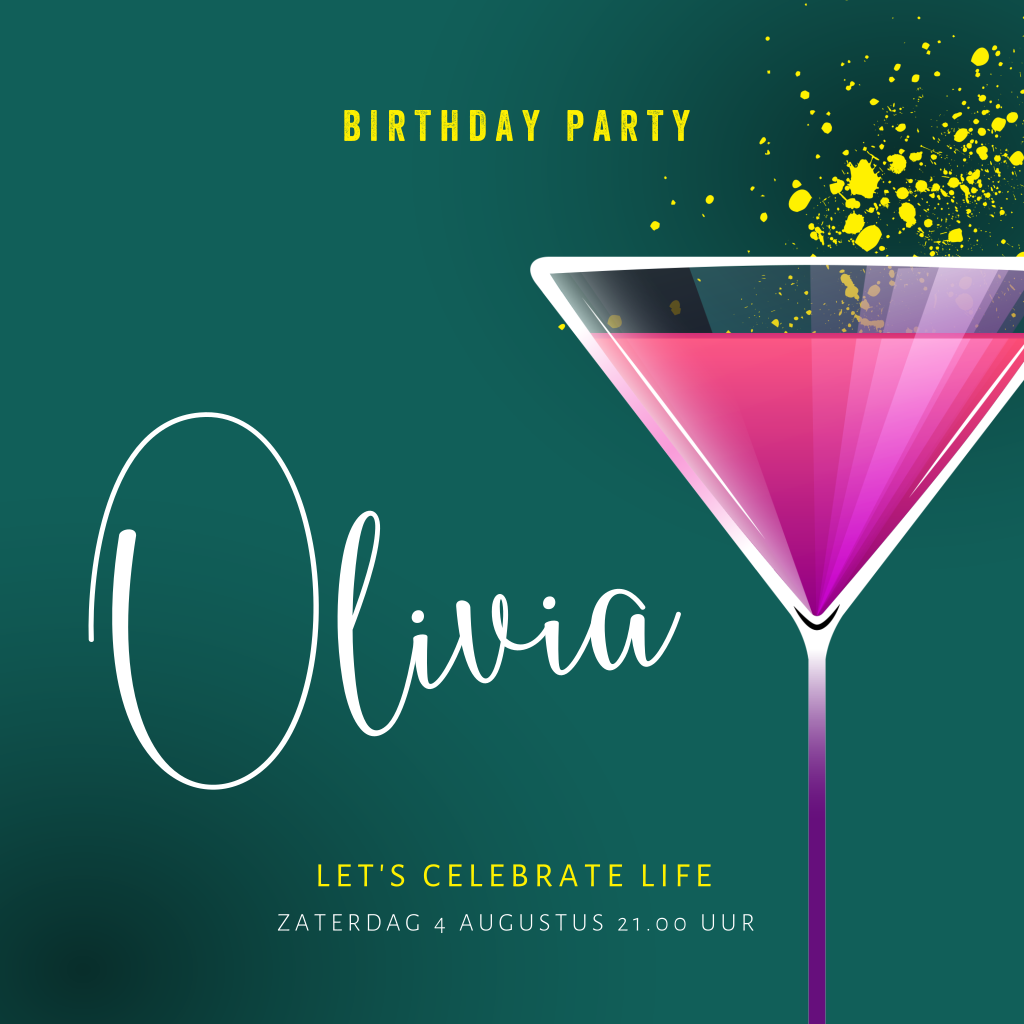 Een sprankelende uitnodiging voor een 30 jarige vrouw. Met cocktailglas op de voorzijde en gele spetters.