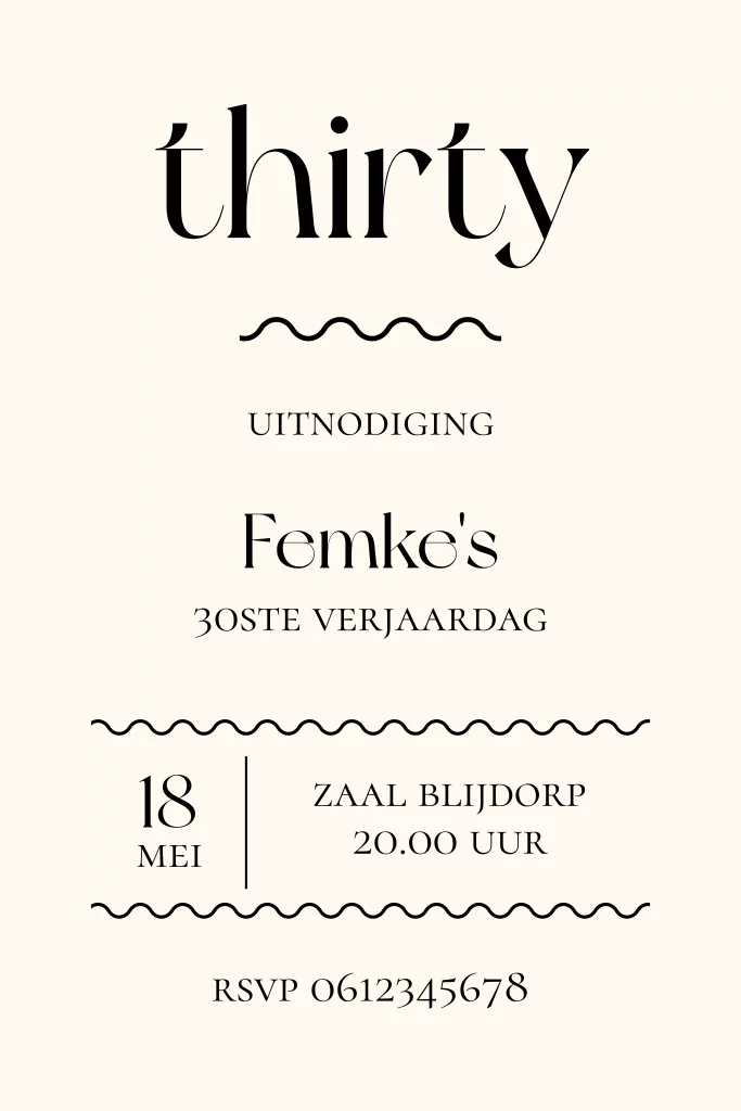 Vier je 30e verjaardag in stijl met deze prachtige typografische uitnodiging. Deze uitnodiging is perfect voor een vrouw die haar 30e mijlpaalverjaardag wil vieren. De cleane en typografische stijl zorgen voor een chic tintje. Pas naar eigen smaak aan in onze online editor. Met de metallic beige envelopkleur maak je deze verjaardagsuitnodiging helemaal in stijl af.