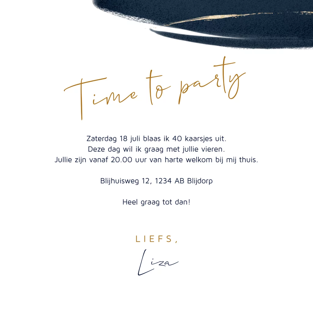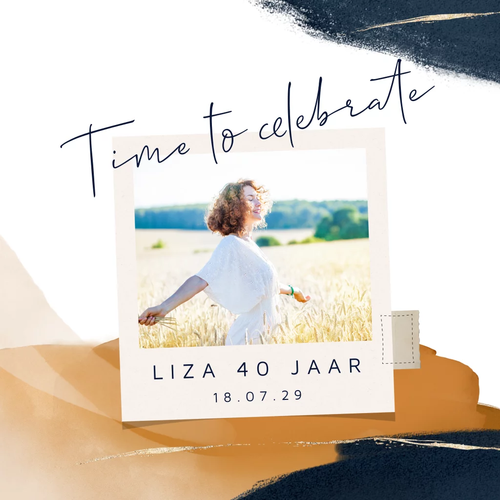 Time to celebrate jouw 40e verjaardag! Op deze uitnodiging plaats je eenvoudig je eigen foto. Op de achtergrond van de kaart hippe aquarelvegen. Teksten, kleuren en lettertypes pas je naar wens aan in onze ontwerpmodule. Hulp nodig? Bel, mail of chat gerust!