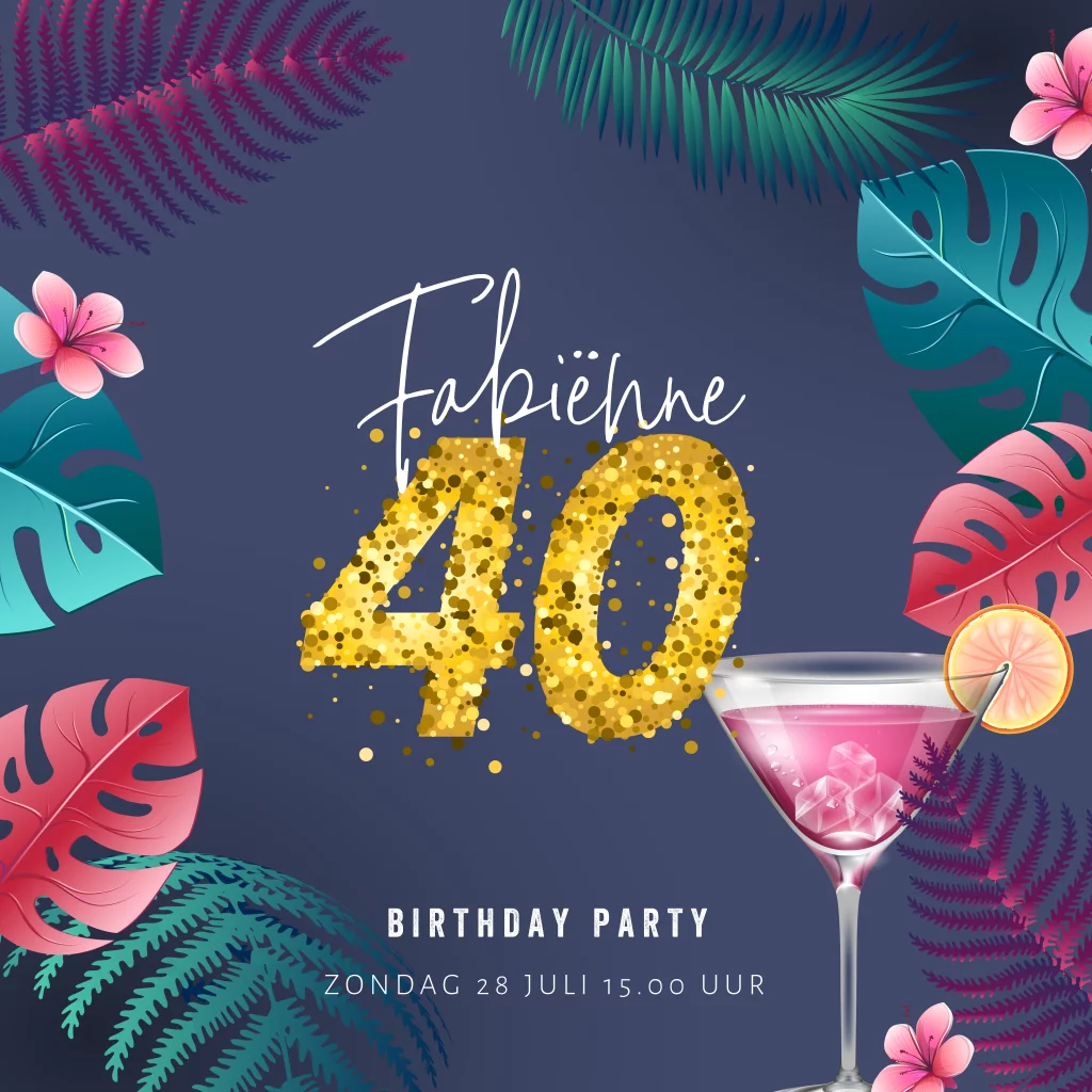 Vrolijke uitnodiging voor een verjaardag 40 jaar. Op deze verjaardagskaart staan kleurrijke botanische bladeren en een feestelijk cocktailglas. Het getal 40 spat van de kaart af in sparkling cijfers. Pas de kaart naar je eigen smaak aan in de editor.