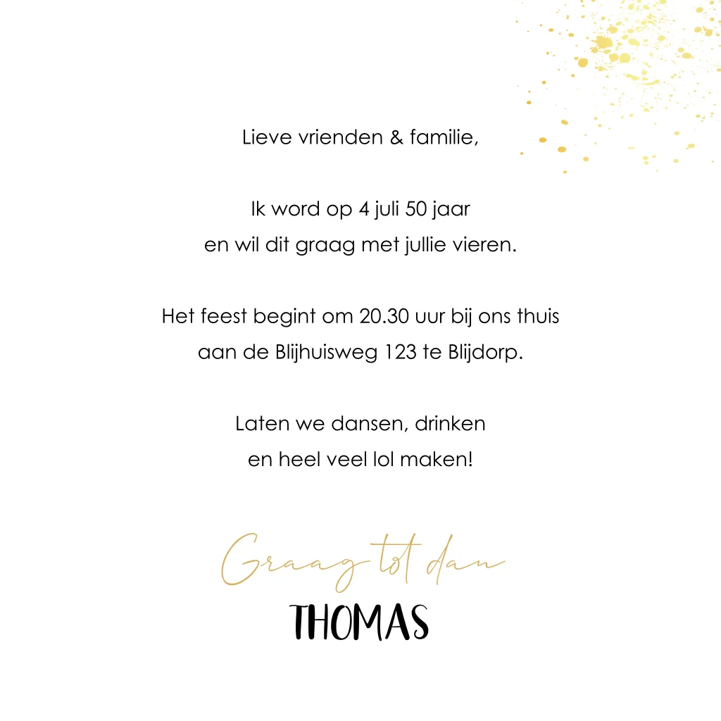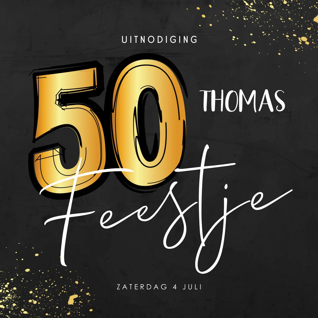Feestelijke uitnodiging voor een verjaardag van een Abraham of Sarah. Met krijtbord achtergrond en goudkleurige spetters en teksten in verschillende lettertypes. De leeftijd 50 jaar is extra groot afgebeeld. Met deze kaart krijg je zeker zin in een feestje!