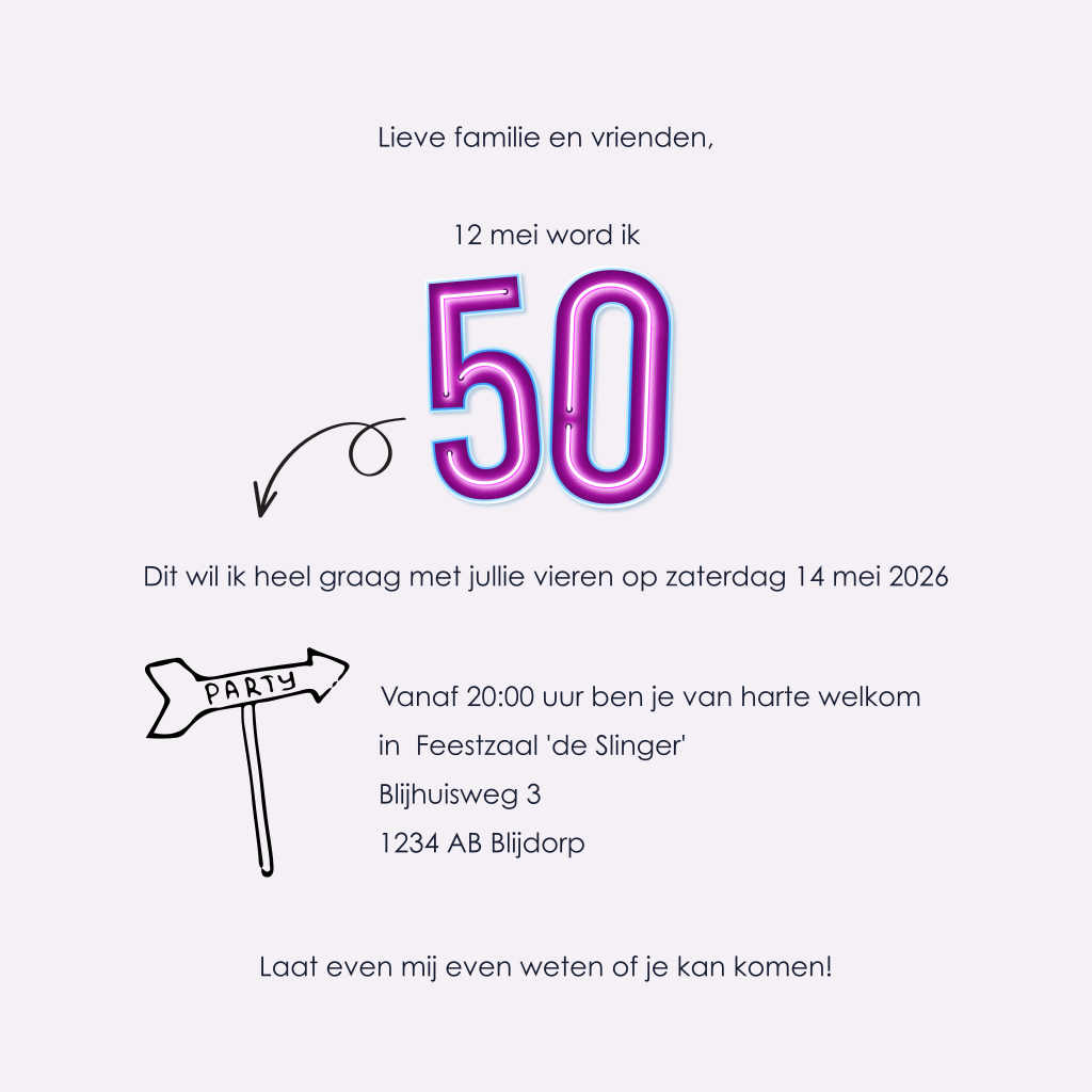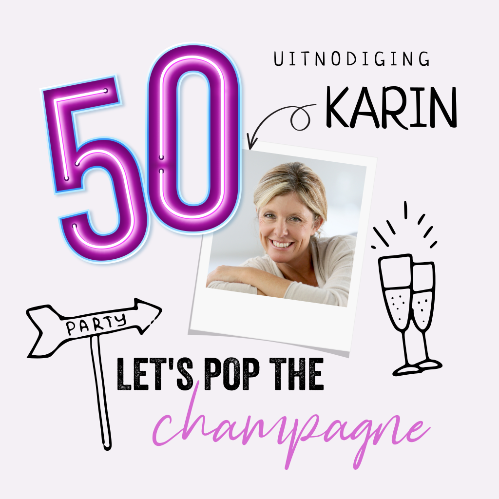 Let´s pop te champagne! Hippe uitnodiging met neon cijfers voor een verjaardag van een vijftig jarige Sarah. Er is gebruik gemaakt van verschillende lettertypes en de proostende champagne glazen maken deze verjaardagskaart extra feestelijk. Vervang de foto in het polaroid kader voor een eigen foto.