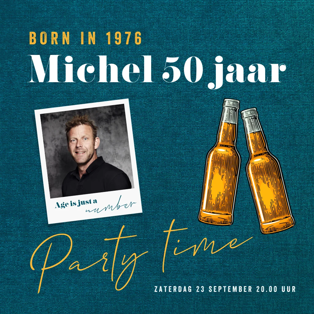 Stoere uitnodiging man 50 jaar met bierflesjes en foto