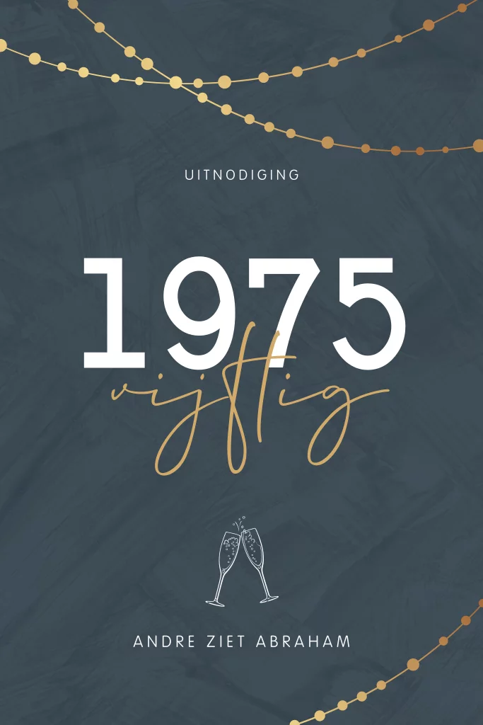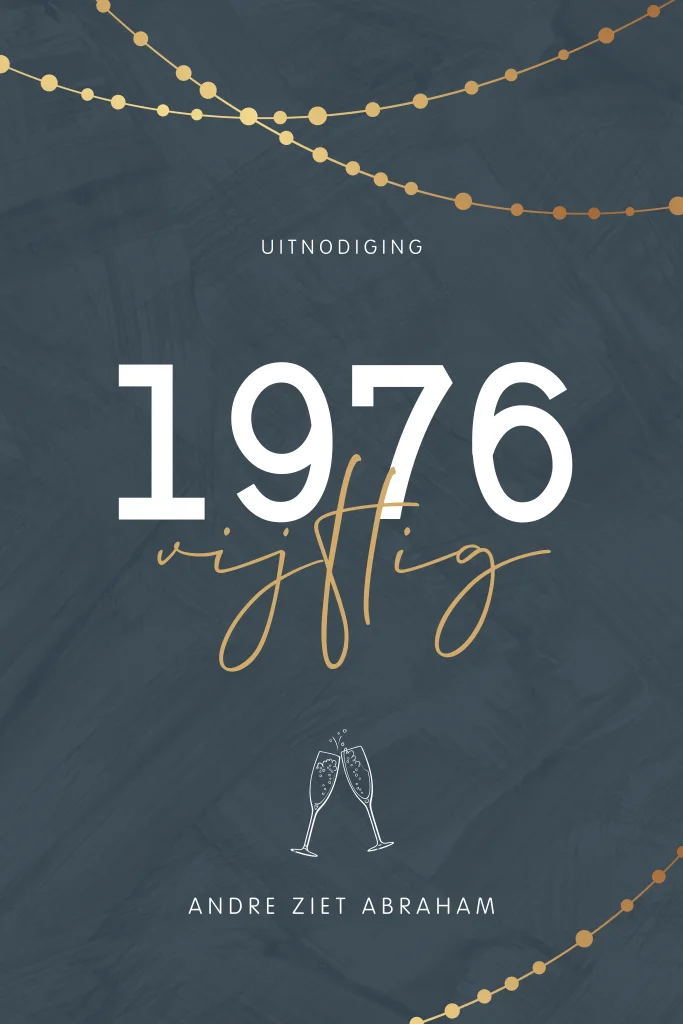 Word jij dit jaar vijftig? Kies dan voor deze stoere en toch stijlvolle uitnodiging voor een 50ste verjaardag. Op de achtergrond een blauw grijze krijtbordlook met gouden slingers en proostende champagneglazen. Deze kaart heeft verschillende lettertypes in wit en gouden kleur, pas deze naar eigen wens gemakkelijk aan in onze editor.