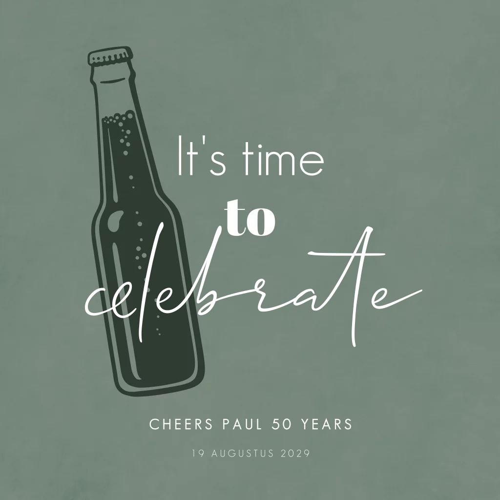 "It's time to celebrate", want jij bent 50 jaar geworden! Op dit luxe kaartje "celebrate" in goudfolie: want dat mag er wel uitspringen! Verder op dit kaartje met afgeronde hoeken een bierflesje voor een marmerlook achtergrond.