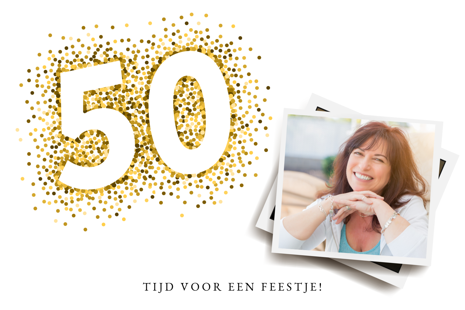 Moderne en stijlvolle verjaardagsuitnodiging voor 50 jaar met eigen foto en met gouden confetti het getal 50. Liever een andere tekst? Dit pas je eenvoudig aan in onze editor. Er staan verschillende confetti getallen in onze afbeeldingen bank. Dus de uitnodiging is ook aan te passen naar bijvoorbeeld 40 jaar of 30 jaar.