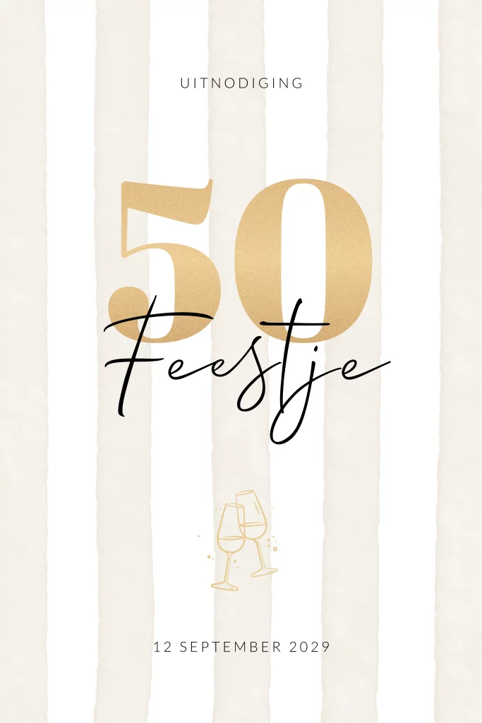 Feestje! Uitnodiging voor een 50e verjaardag. Op deze verjaardagsuitnodiging staat in goudlook het getal 50 met proostende champagne glazen. Deze kaart is overwegend wit en oogt daardoor clean en rustig. Zowel geschikt voor een man als voor een vrouw. Je kunt deze kaart zelf bewerken in de editor en naar je eigen smaak aanpassen.