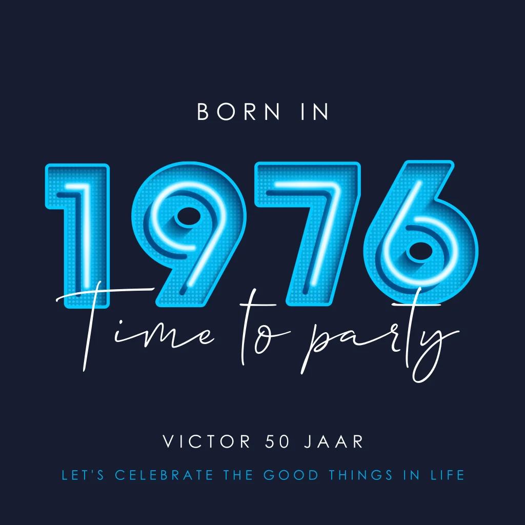 Born in 1976? Time to party in 2026! Met deze stoere uitnodigingskaart nodig je familie en vrienden uit voor een feestje. Het jaartal staat in blauwe neon cijfers en knallen van de kaart af, in combinatie met de donkerblauwe achtergrond en witte letters. Deze kaart kan zowel voor een Abraham of een Sarah worden gebruikt. Pas de kaart naar je eigen wensen aan in de editor.