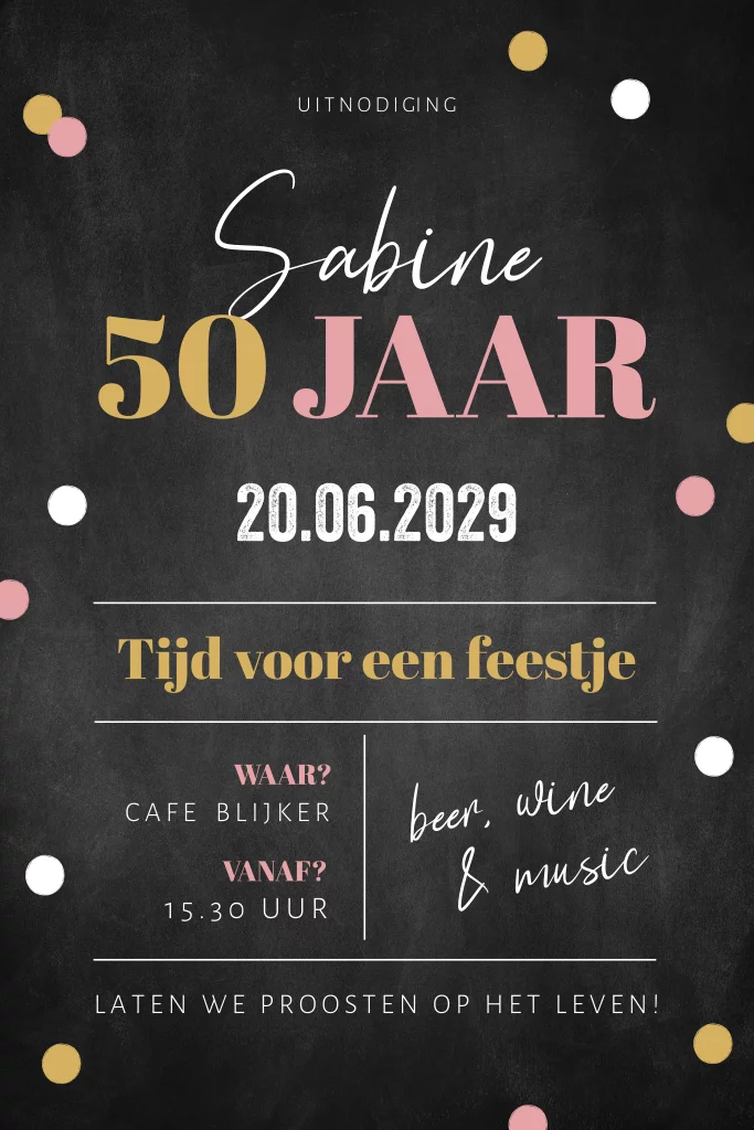 Typografische uitnodigingskaart voor een verjaardag 50 jaar. De achtergrond is krijtbord met daarop gekleurde confetti en teksten in verschillende lettertypes. Alle teksten en kleuren zijn eenvoudig aan te passen in onze editor.