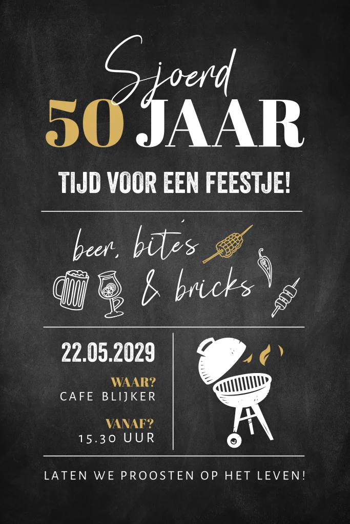 Trendy uitnodiging voor een verjaardag 50 jaar. De achtergrond van de kaart is krijtbord met daarop een bbq. De teksten hebben verschillende lettertypes wat een heel mooi speels geheel geeft.
