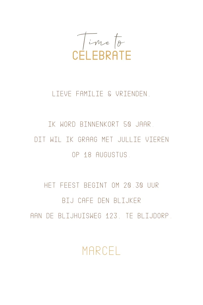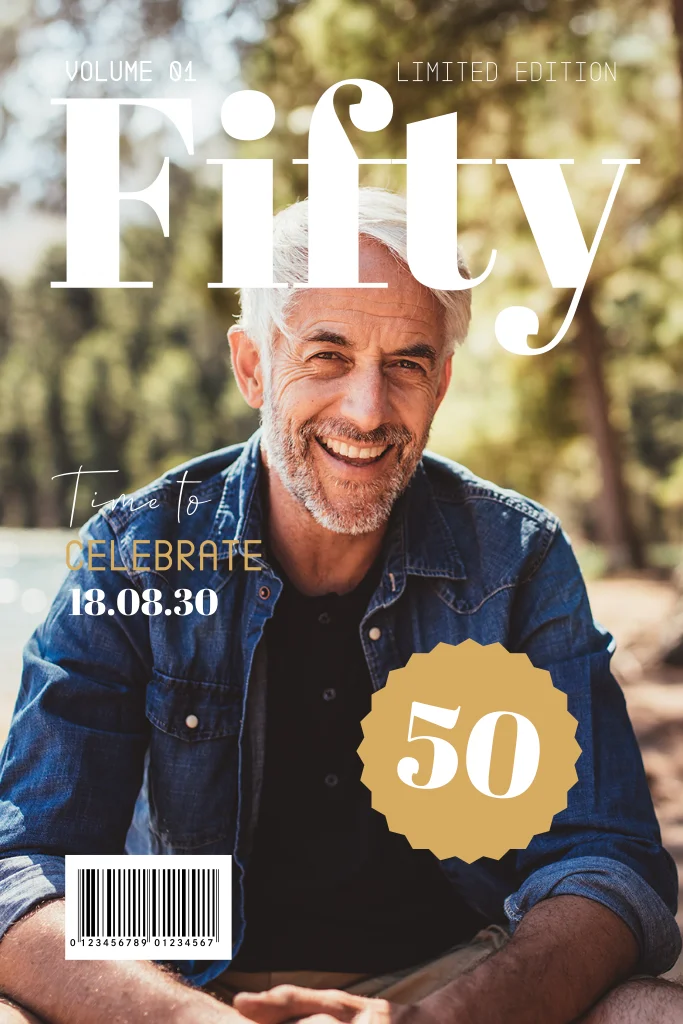 Zie jij binnenkort abraham? Time to celebrate! Vier je 50e verjaardag met deze hippe magazine uitnodigingskaart. Deze kaart heeft op de voorzijde ruimte voor een eigen foto en is afgewerkt in magazine stijl door bijvoorbeeld de streepjescode. Pas deze uitnodiging makkelijk zelf in onze online editor.