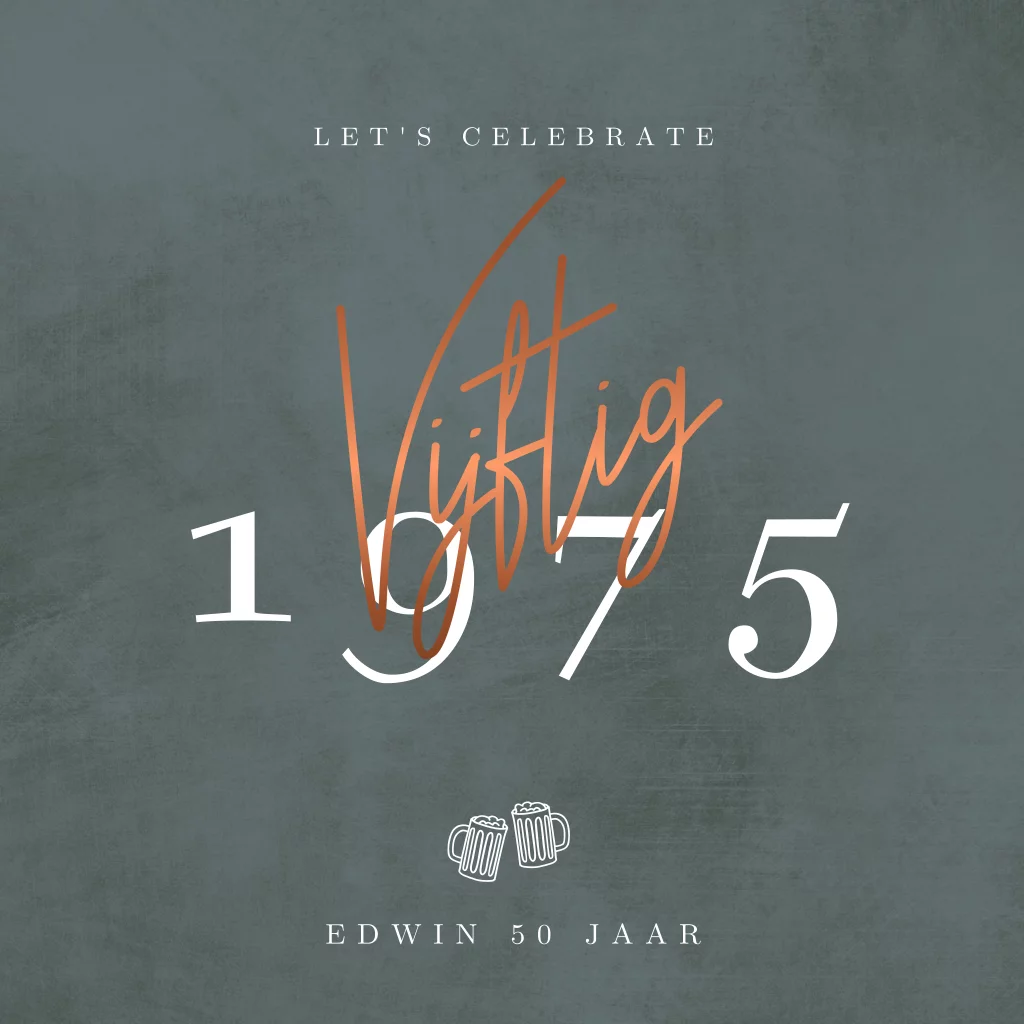 Hippe uitnodigingskaart voor 50 jaar met jaartal. Deze verjaardagskaart heeft een ruwe donkergroene achtergrond met tekst in wit en koperkleur. Een mooie combinatie. De proostende bierglazen maken de kaart extra feestelijk. Liever andere kleuren of lettertypes? Dit is gemakkelijk aan te passen in de editor.