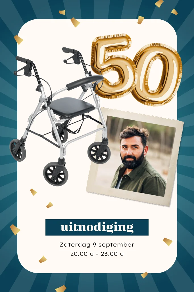 Grappige verjaardagsuitnodiging voor een man die vijftig jaar wordt en dus Abraham ziet. De uitnodiging heeft een blauwe achtergrond met wit kader en gouden confetti met een cijferballon van de leeftijd 50. Het grappige is dat je een rollator ziet om aan te geven dat je oud begint te worden. Zet in het kader een leuke foto van jezelf en maak de uitnodiging zo nog persoonlijker. Pas de uitnodiging eenvoudig aan in de editor.