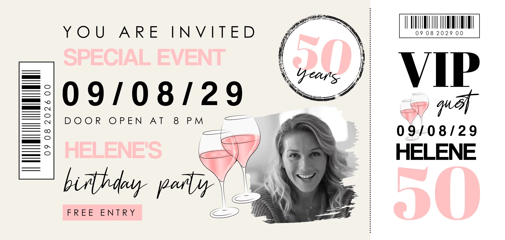Hippe uitnodiging in ticket stijl voor een vijftig jarige verjaardag met eigen foto en streepjescode. Op de kaart staan wijnglazen met tekst die eenvoudig zelf is aan te passen. Wie nodig jij als VIP uit op jouw special event?