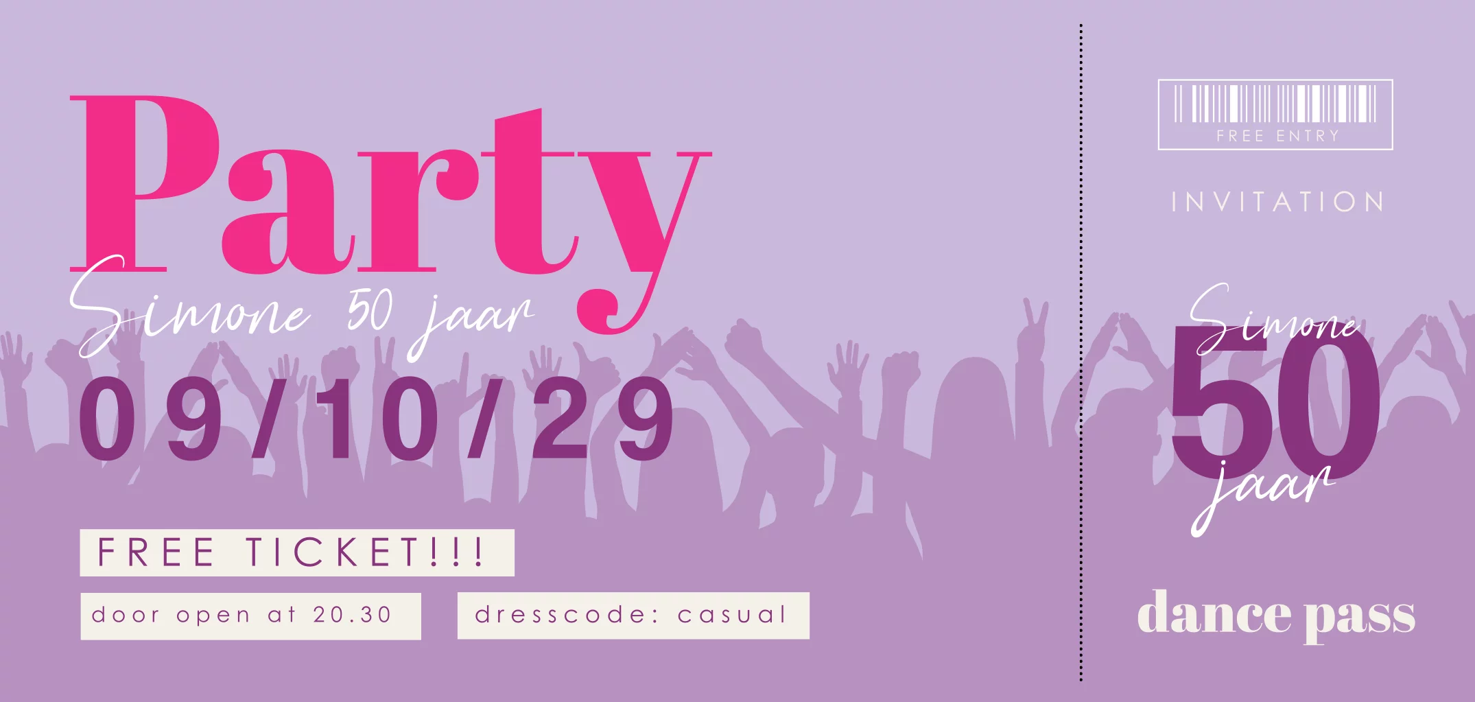 Hippe uitnodiging in ticket stijl voor een vijftig jarige verjaardag. Op deze kaart staan verschillende lettertypes tegen een paarse achtergrond met dansende en feestende mensen. Pas de tekst gemakkelijk aan in de editor.