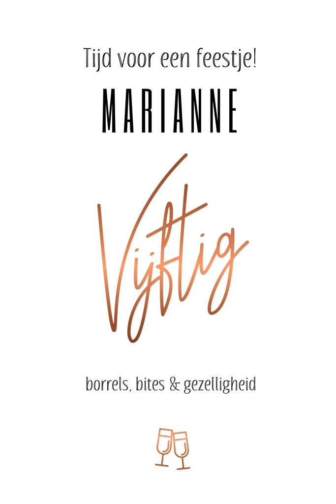 Hippe uitnodigingskaart voor een 50ste verjaardag. Op deze verjaardagskaart die zowel voor een Abraham als Sarah geschikt is, zijn het woord vijftig en de proostende glazen in een mooi koperverloop afbeelding. Hierdoor krijgt deze uitnodiging een stijlvolle uitstraling.