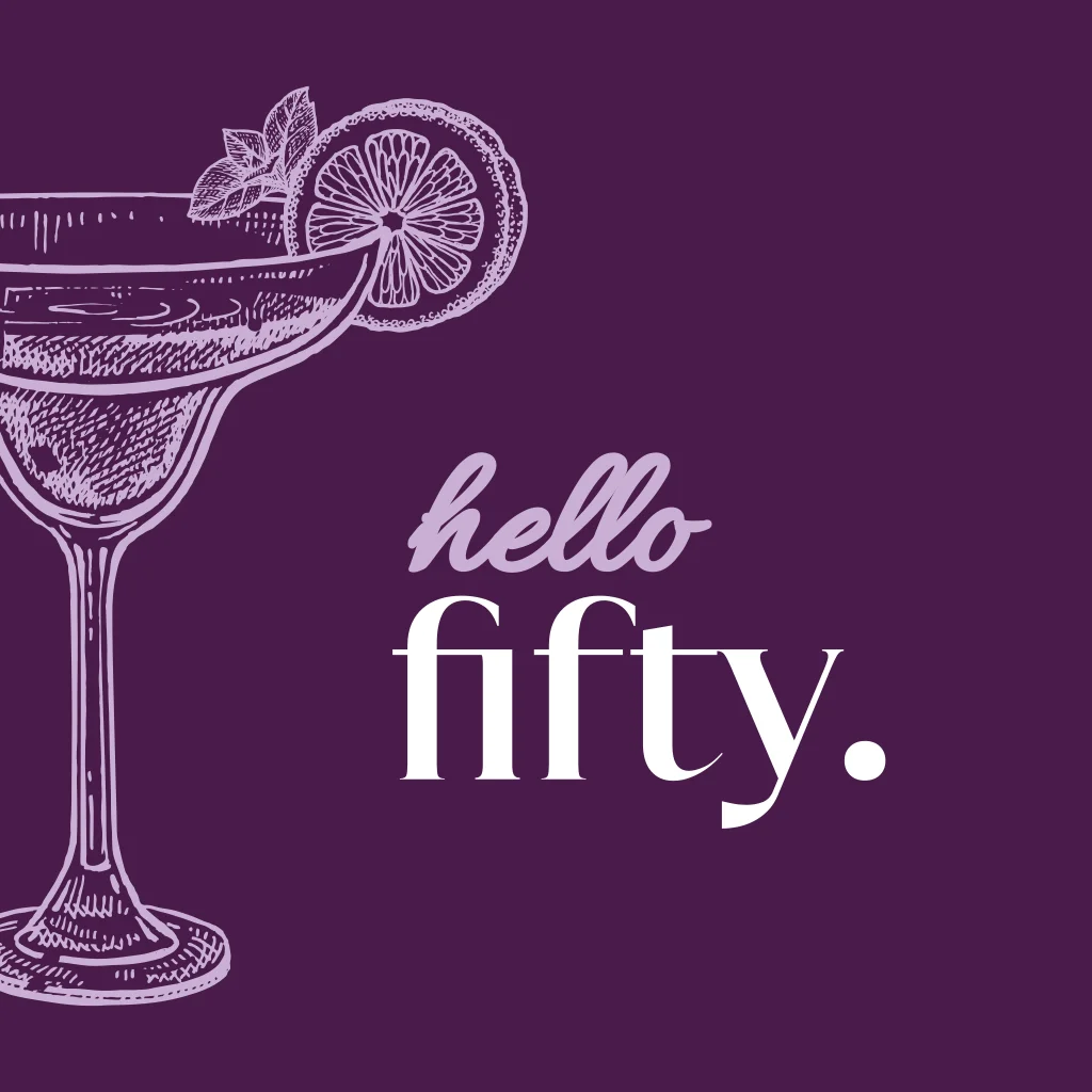 Hippe uitnodiging voor een vijftigste verjaardag van een vrouw met mooie paarse achtergrond met illustratie van een cocktailglas en de tekst 'hello fifty'. Pas de uitnodiging naar je eigen smaak aan in de editor.