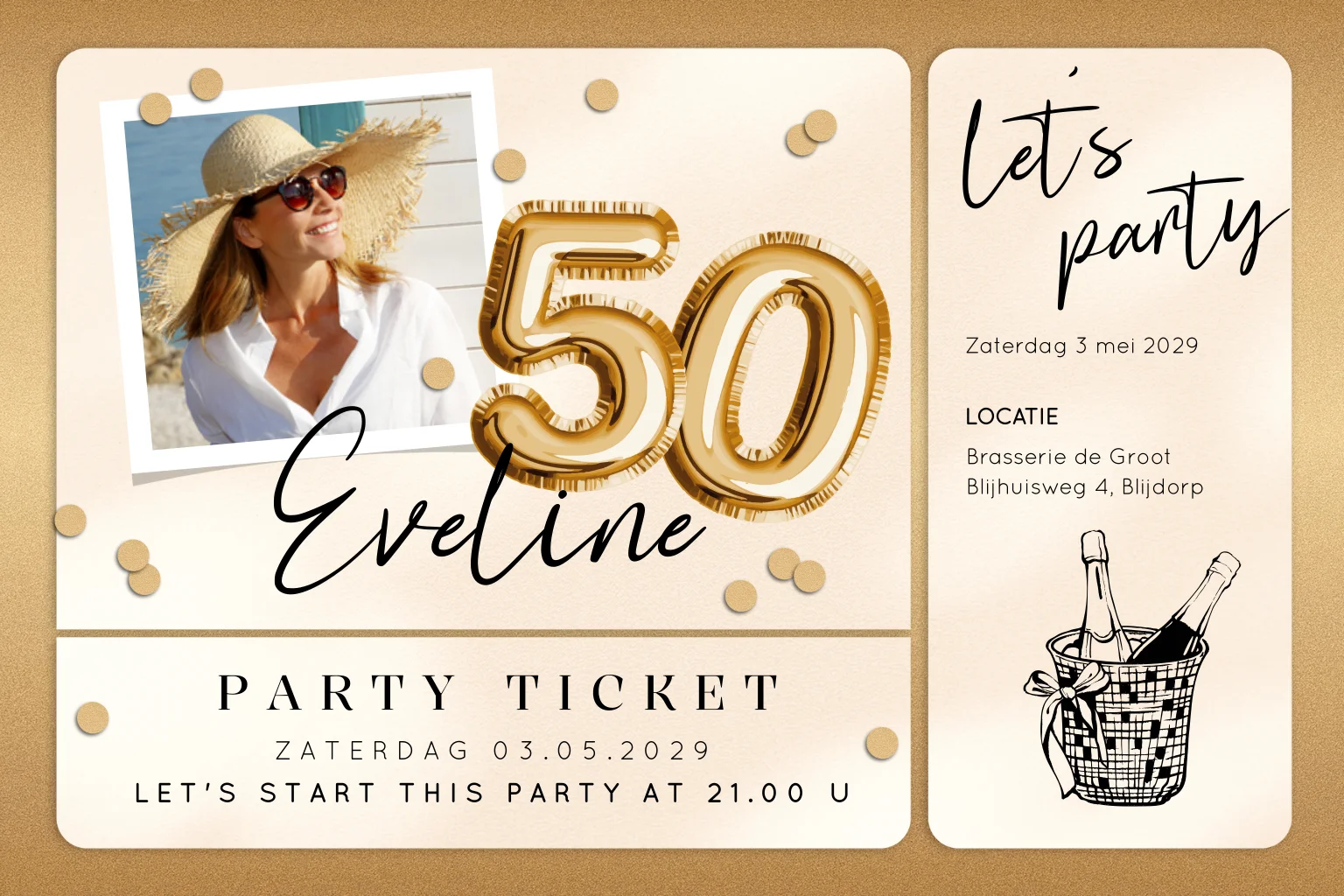 Sarah gezien? Tijd voor een feestje! Nodig al je vrienden en familie uit met deze fantastische uitnodiging voor je 50e verjaardag. Op deze kaart zie je een cijferballon 50 met confetti, een geïllustreerde champagne emmer en verschillende kaders voor de tekst van je uitnodiging. Stel deze uitnodiging in onze online editor af op je eigen wensen en laat je gasten versteld staan. Maak van deze mijlpaal een onvergetelijke verjaardag.