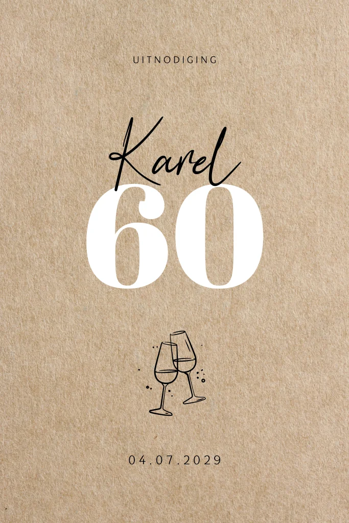 Kondig jouw zestigste verjaardag aan met deze rustige uitnodigingskaart met een kartonnen achtergrond, waarop het getal 60 groot staat. natuurlijk kun je gemakkelijk het getal 60 aanpassen naar 65 jaar. Deze kaart is geschikt voor zowel een man als vrouw.